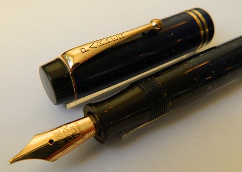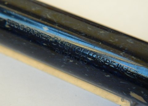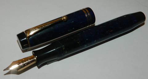 marmoreret Parker Duofold fyldepen fra 1930´erne. Velholdt. Fremstår i god stand. Alle dele original Parker. Ny gummisæk skal indsættes før brug. Ved tillæg på kr. 325,00 kan fyldepennen leveres med ny gummisæk. 11 cm lang.