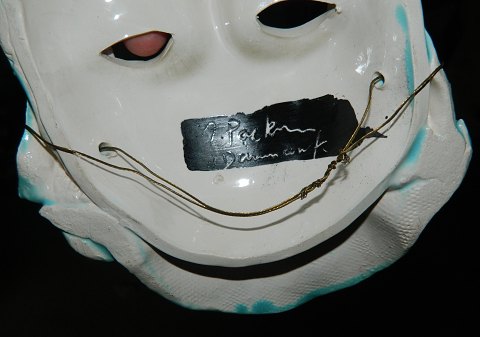 Hvid glaseret maske i keramik med turkis hovedbeklædning. Fremstillet hos Jesper Packness keramik ca. 1990. Fremstår i perfekt stand uden skader eller reparationer. Fabriksmærket på bagsiden. 23 cm høj og 16 cm bred.