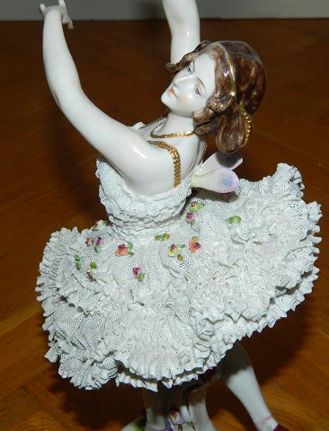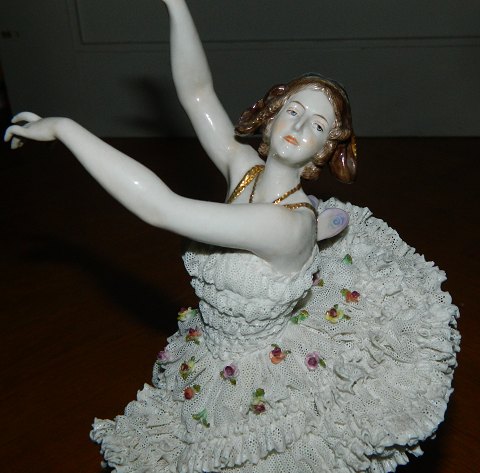 Figur i fajance af baletdanserinde med vinger og skørt i krenoline. Smådeffekter her og der på skørt. Ingen alvorlige afslag. Øvrige dele af figuren i god stand uden skader eller reparationer. Fabriksmærket på bunden. Formodes at være fremstillet i Tyskland omkring 1920. 35 cm høj.