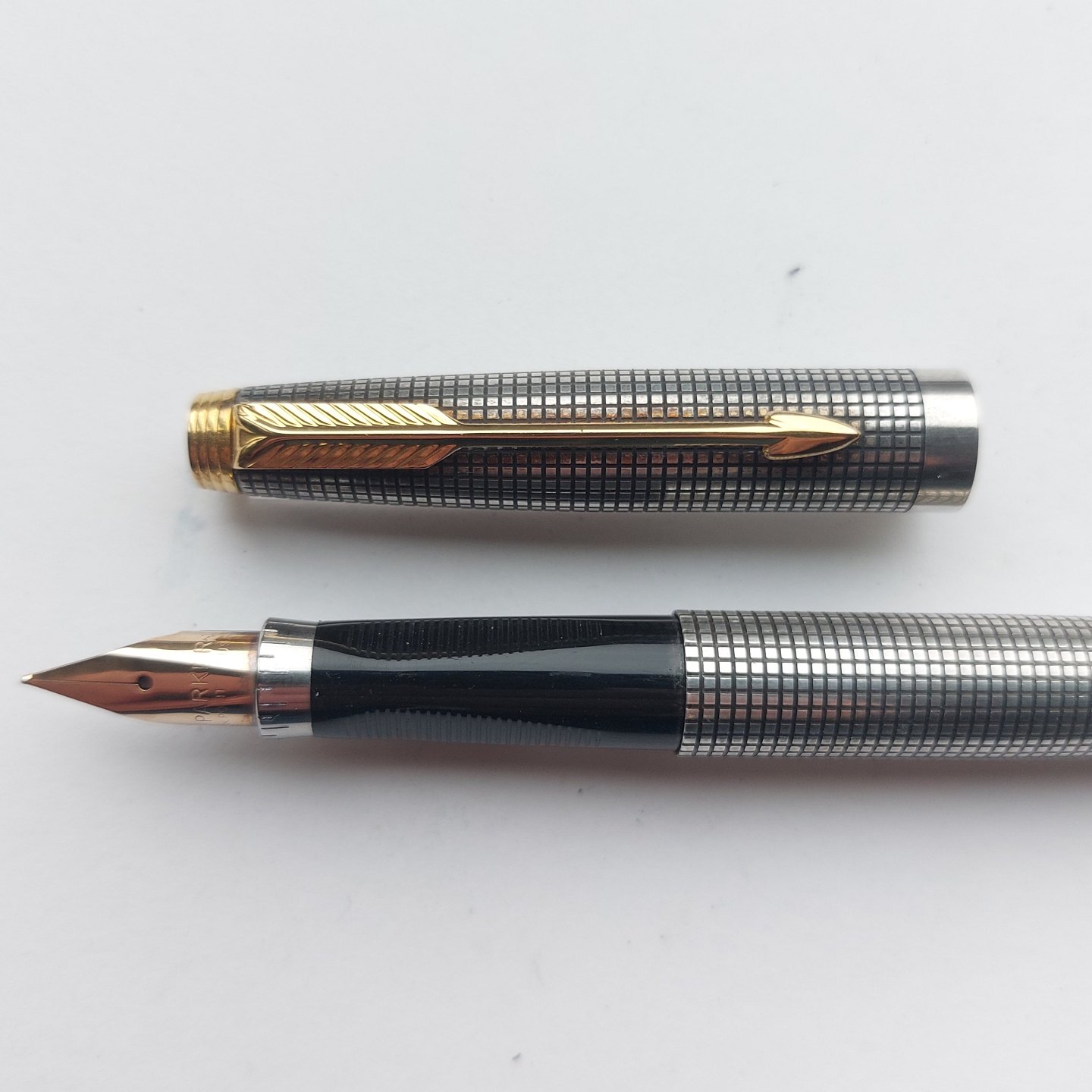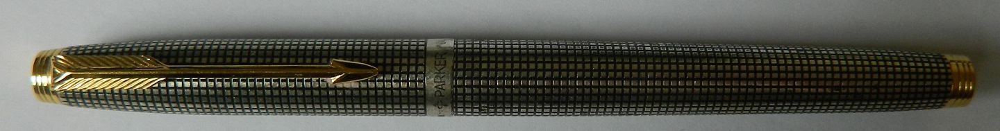 Parker fyldepen i 925S Sterling sølv. Fremstillet i Frankrig eller U.S.A. Alle dele originale bl.a. 585 guldspids. Ingen skader eller reparationer. Ingen buler eller stød. Klar til at blive brugt med "gammel" gummisæk. 13 cm lang.