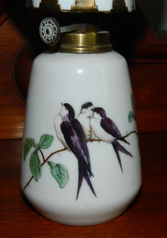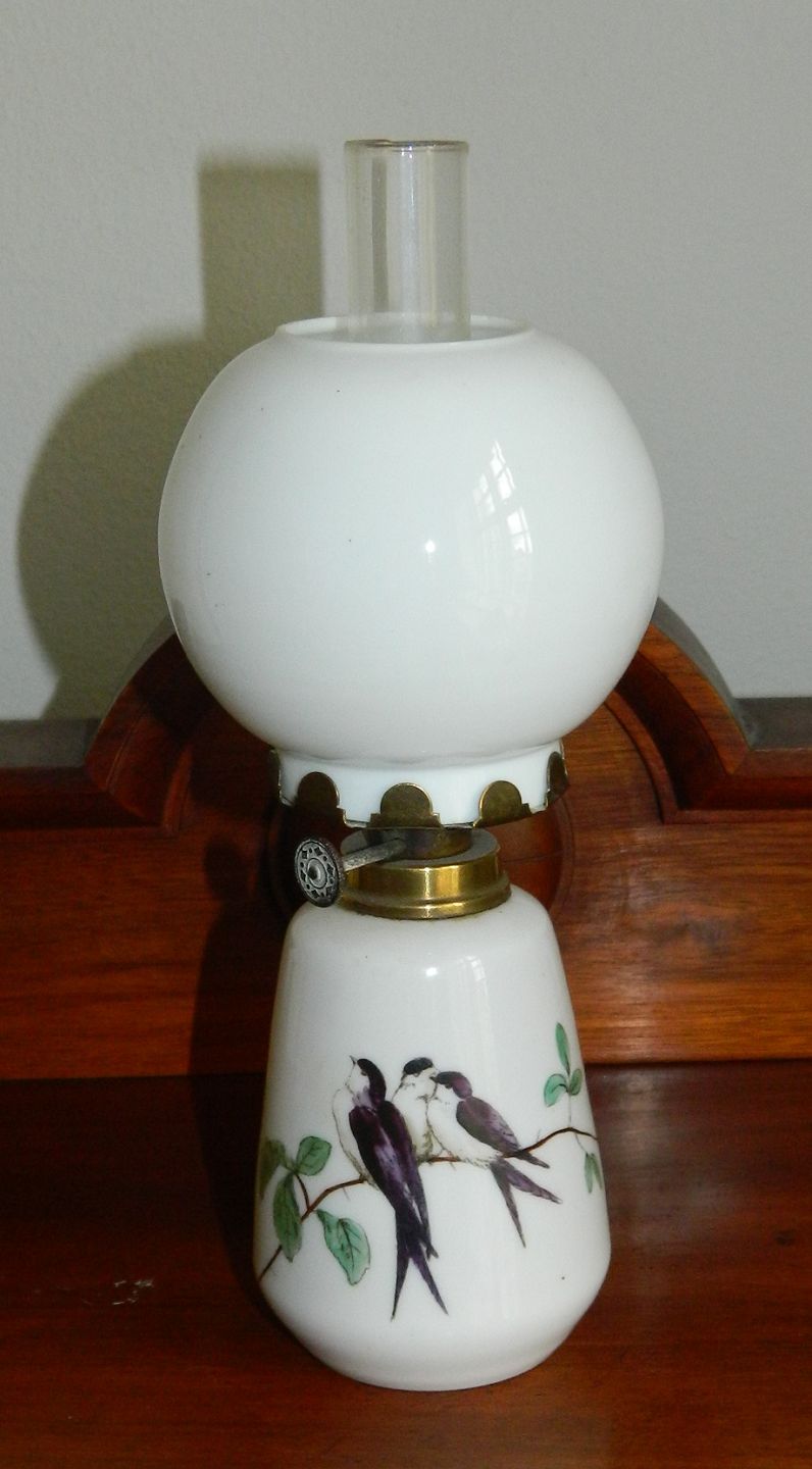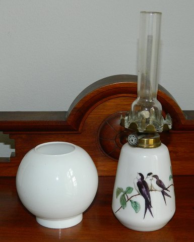 Lille olielampe i hvidt glas samt hvid skærm i glas. Dekoreret med svaler. Fremstillet hos Fyens Glasværk omkring 1900. Fremstår i perfekt stand. Ingen skader eller reparationer. Modelnummer på bunden. Total 21 cm høj.