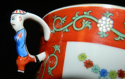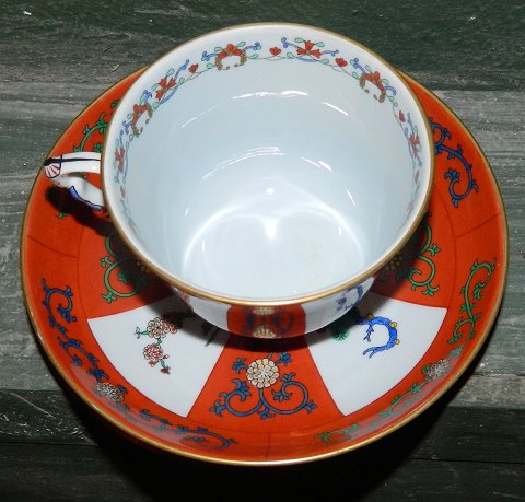 Porcelæn fra Ungarn: Stor kop og underkop fra den ungarnske porcelænsfabrik Herend. Kinesisk tema og dekorationer. "Kinamand" som hank. Hanken har en revne - muligvis fabriksfejl ! Både kop og underkop smukt dekoreret med gennembrudt fod. Koppen er 8 cm høj. Begge dele fabriksmærket. Underkoppen er 3½ cm høj og 17 cm i diameter.
