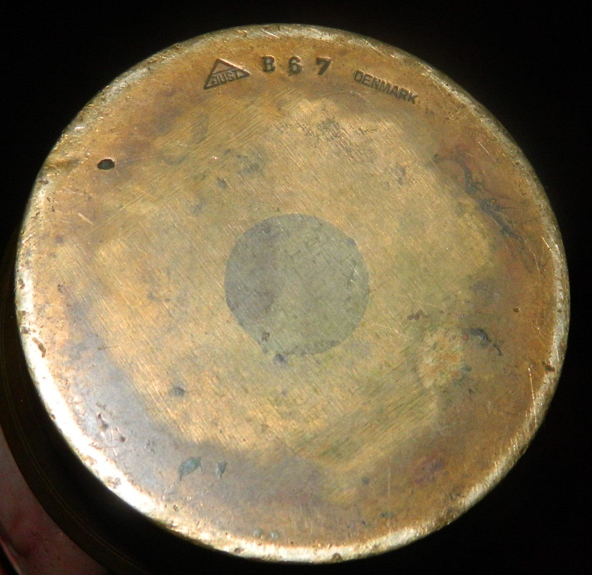 Tung vase i bronze af Just Andersen (1884-1943) fra ca. 1930. Form og dekoration af nøgen kvinde og mand i Art Deco stil. Fremstår i god stand uden skader eller reparationer. Almindeligt brugsslid. Fabriksmærket på bunden med fabrikslogo samt modelnummer B 67 samt DENMARK. Mål: H. 20½ cm Ø. 12½ cm