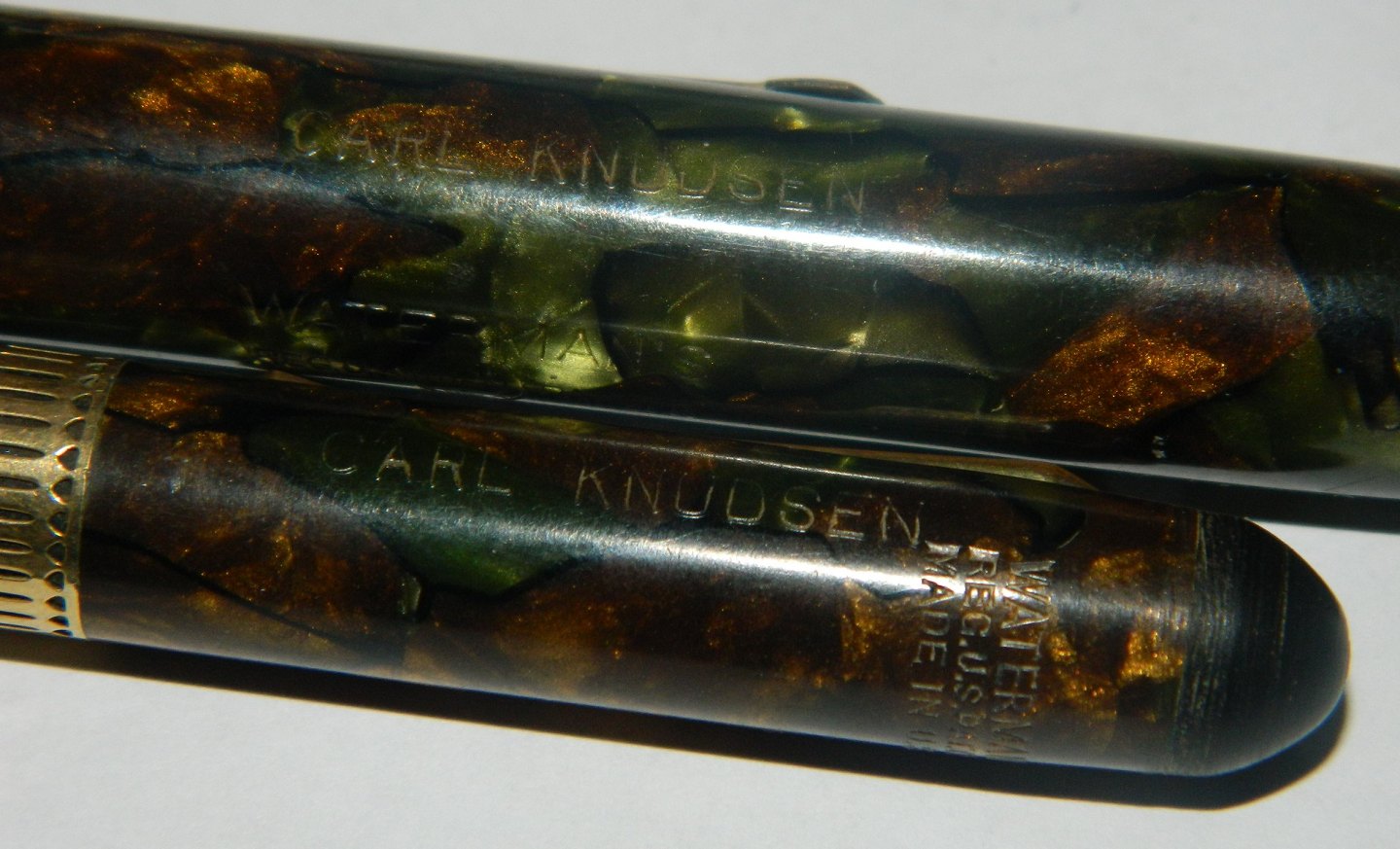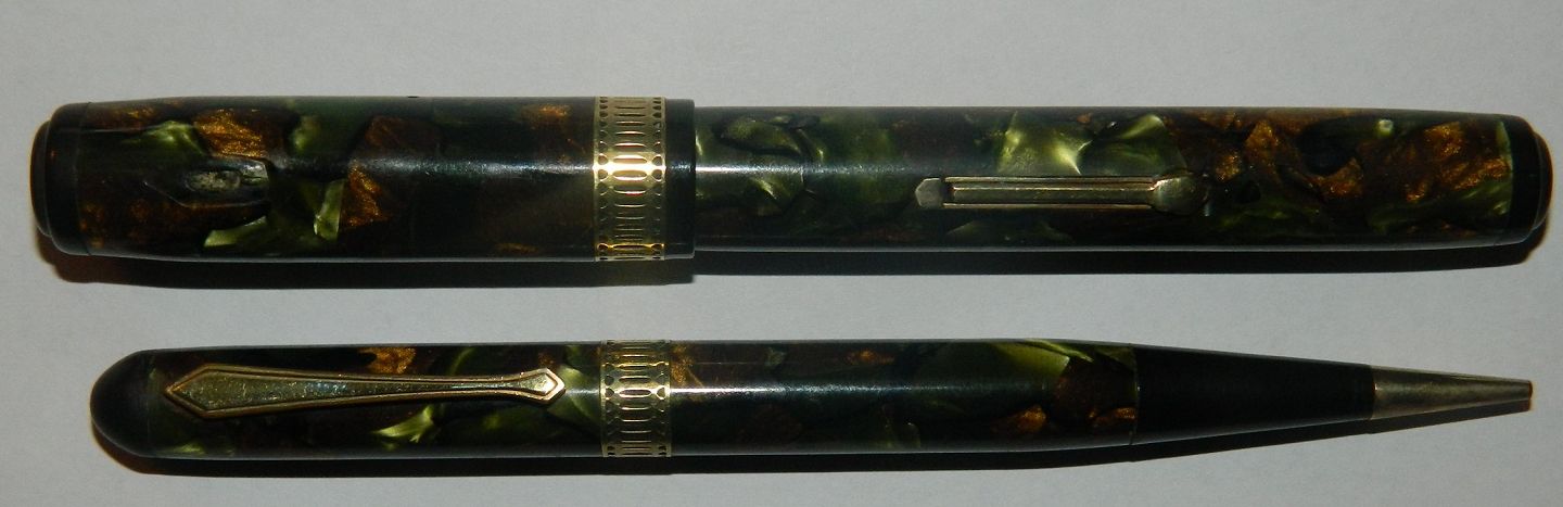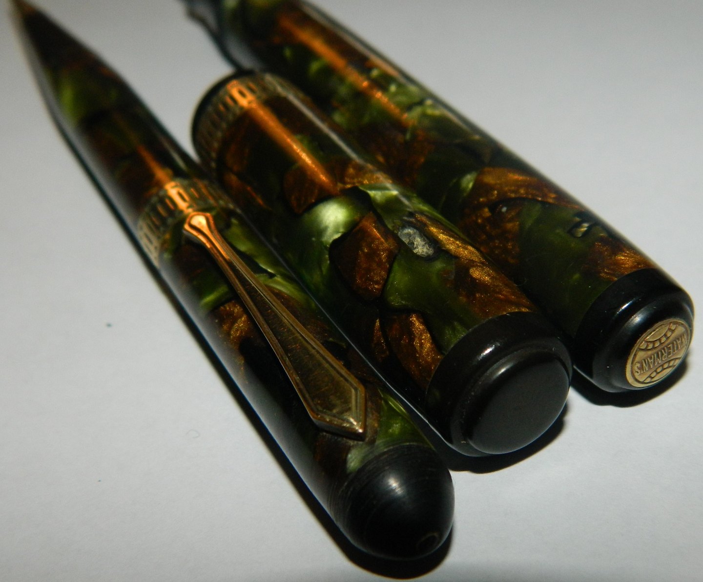 Grøn marmoreret Waterman´s Ideal Patrician fyldepennesæt fra 1930´erne. Fremstillet i U.S.A. Fyldepennen med fyldning af blæk med leverfiller. Fyldepennen er lige ved 14 cm lang pencilen 13½ cm. Begge med indgraveret navn. Fydepennen mangler sin clip ellers er begge dele i meget flot stand. Der skal indsættes ny gummisæk i fyldepennen før end den virker igen. Omsækning koster kr. 325,- Sættet sælges samlet