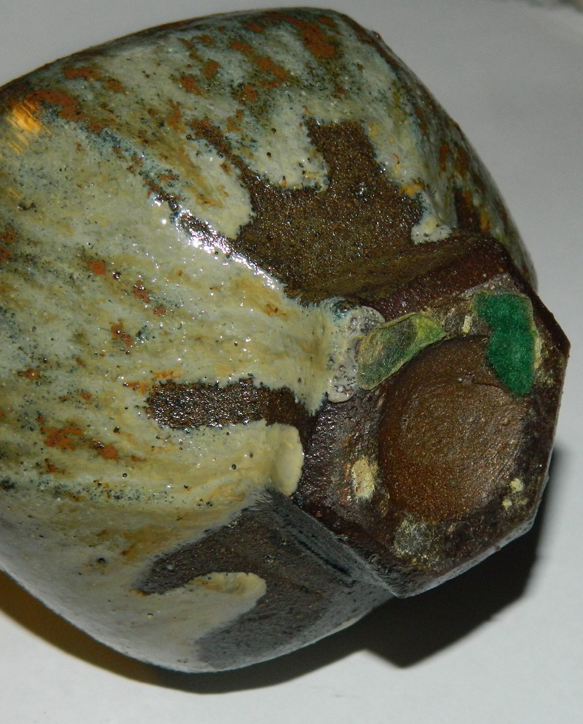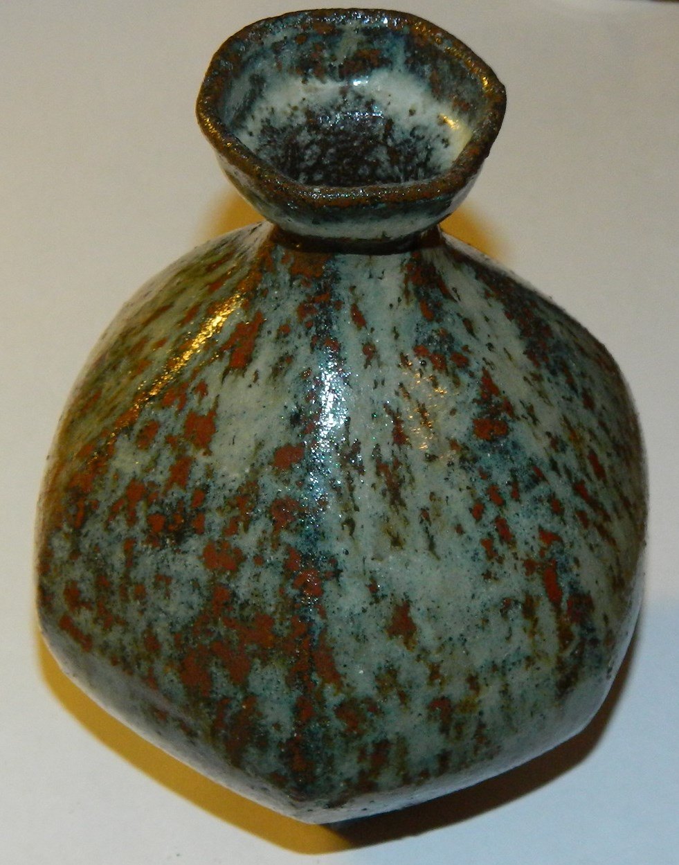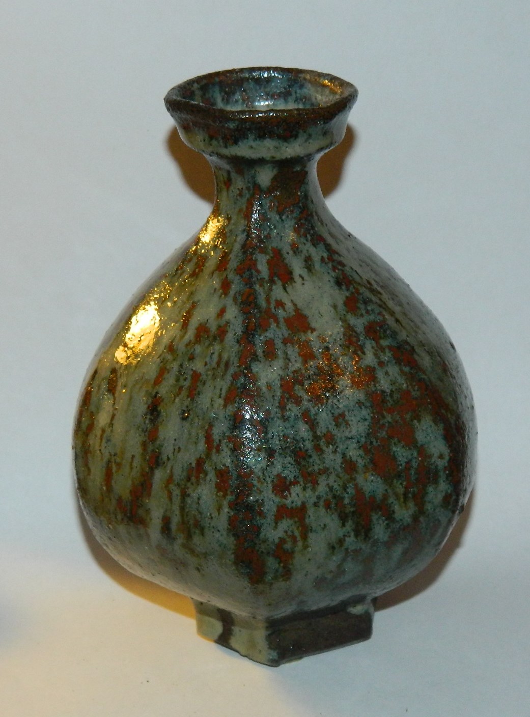 Glaseret seks-kantet vase på fod i keramik af Gutte Eriksen. Ej signeret. Ingen skader eller reparationer. H. 15 cm.