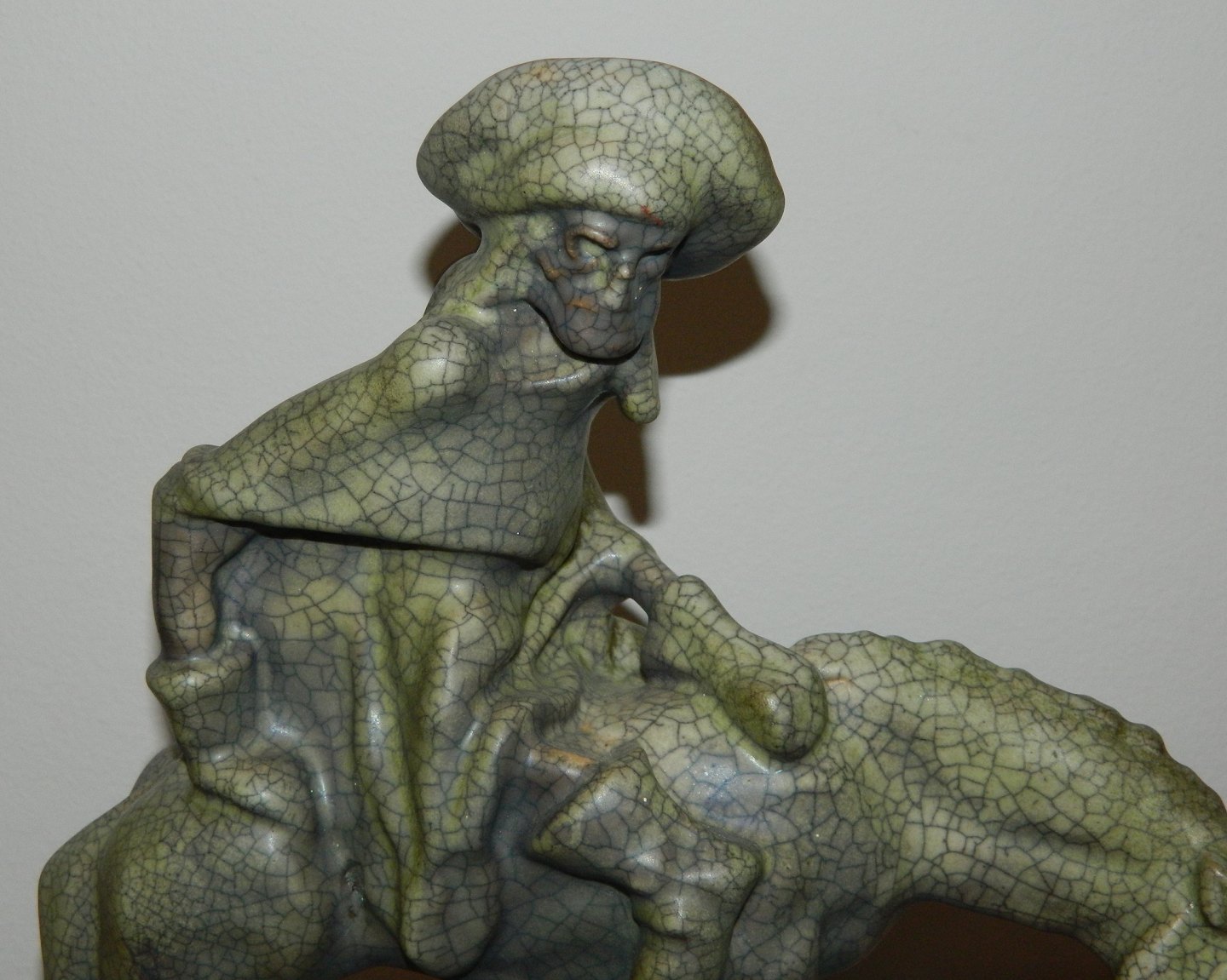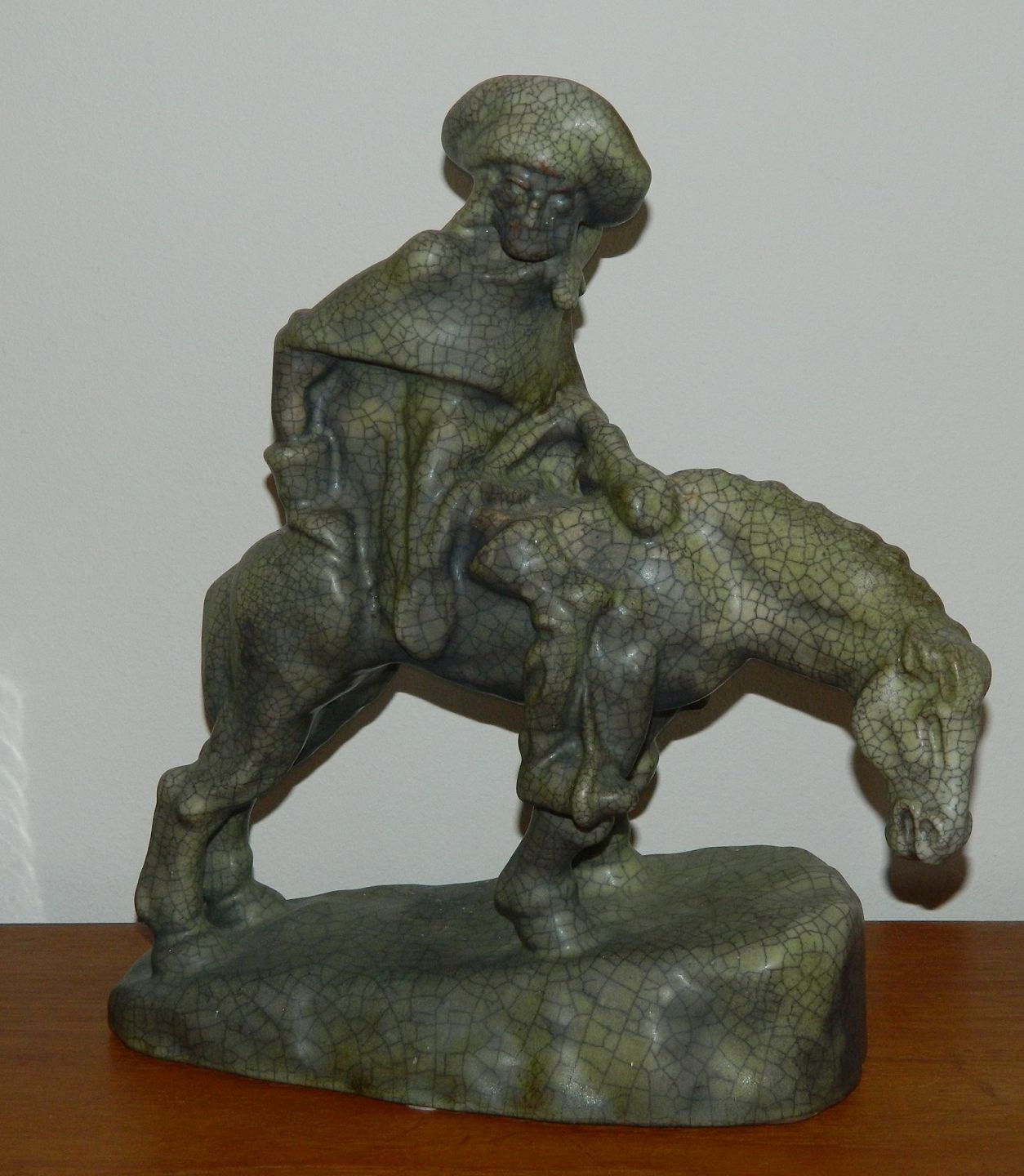 Døden som rytter. Figur i keramik fra Michael Andersen & Søn. Dækket af krakkeleret glasur. Fremstår i perfekt stand uden skader eller reparationer. MA&S fabrikslogo, Rønne´s Byvåben, i relief på undersiden sammen med modelnummer: 3226. Mål: H. 34 cm. L. 32½ cm.