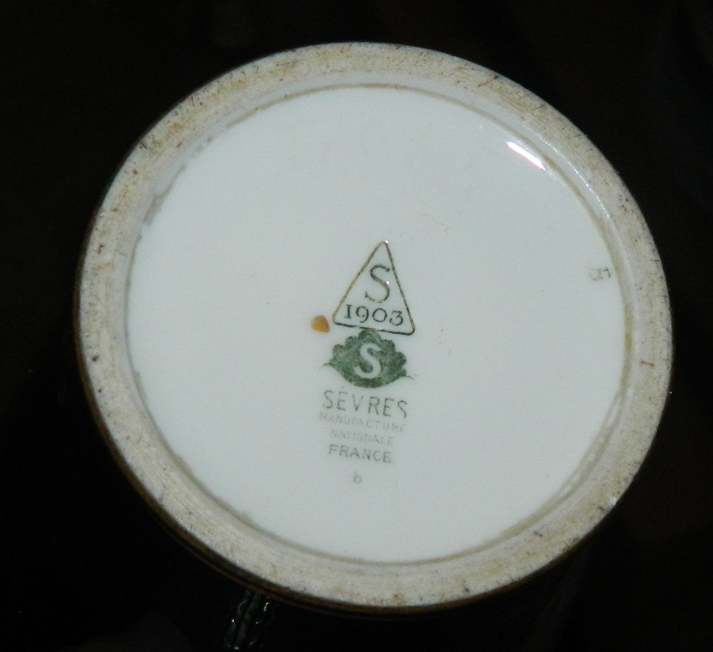 Organisk formet vase i porcelæn fra Sevres. Dækket af blå glasur med trekløver dekoration i guld. I perfekt stand. Form og dekoration i Art Nouveau stil. På bunden fabriksstemplet samt 1903. Vase er 24½ cm høj.