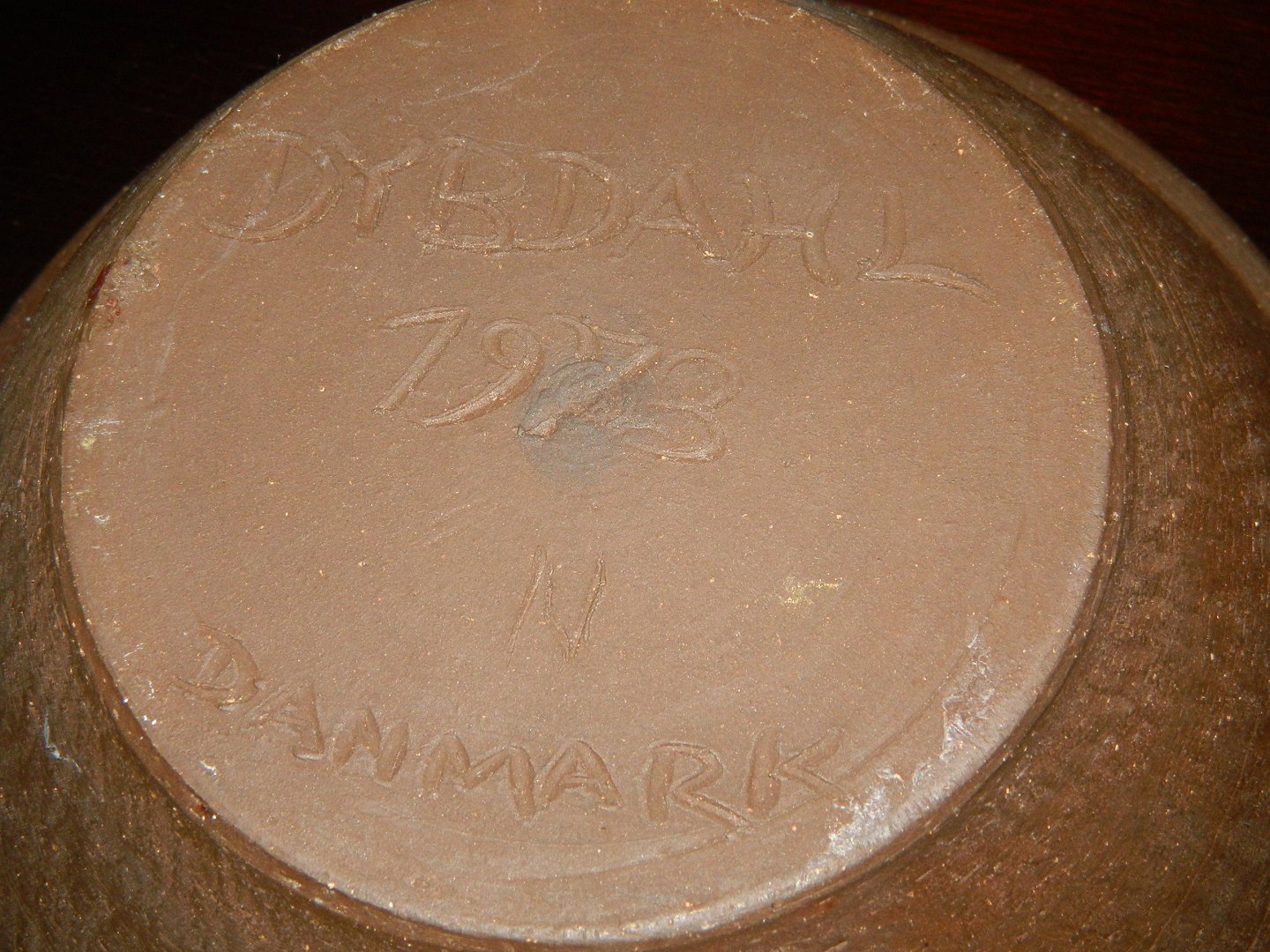 Skål i keramik fra Dybdahl keramik Danmark. Kun dekoreret og glaseret indvendigt. Produceret i 1973. Anordning til ophængning på væggen på bagsiden. Fremstår i perfekt stand. Fabriksmærket på bunden. Mål: H. 14 cm Ø. 33 cm.