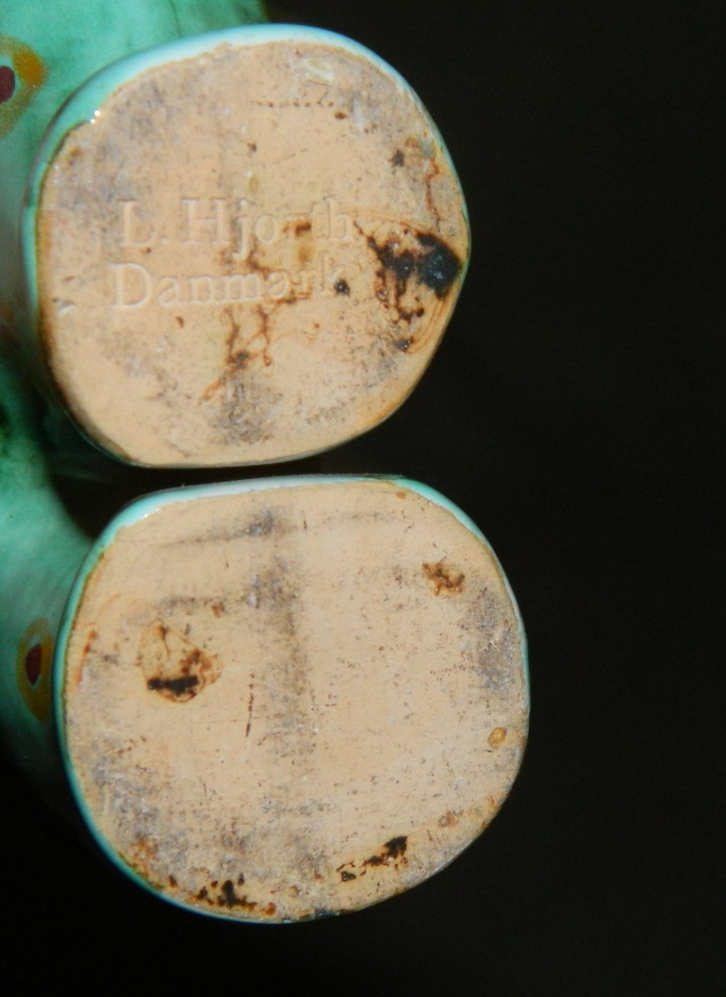Charmerende grønmalet figur med prikker af smilende kamel med store øjne. Fremstillet hos L. Hjorth på Bornholm. I perfekt stand. Fabriksmærket på bunden. Mål: H. 8 cm L. 8 cm.
