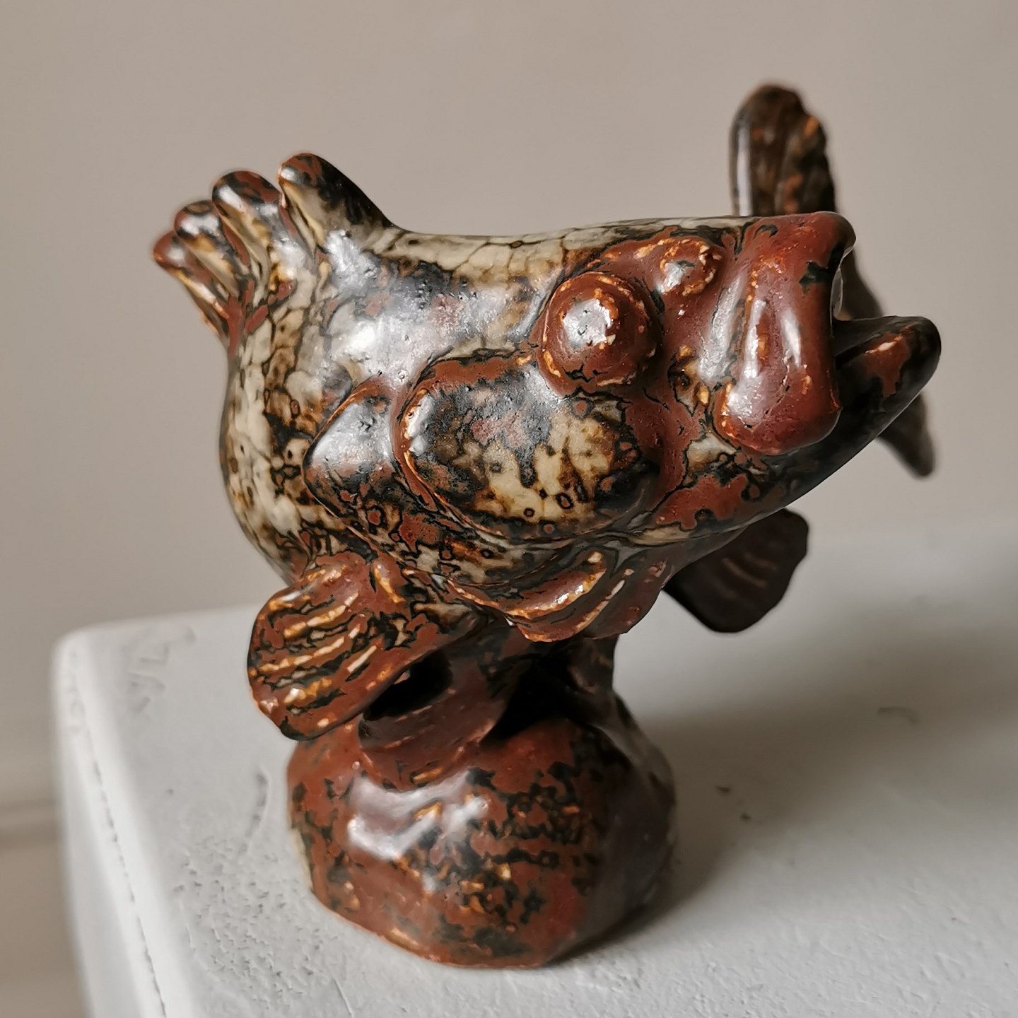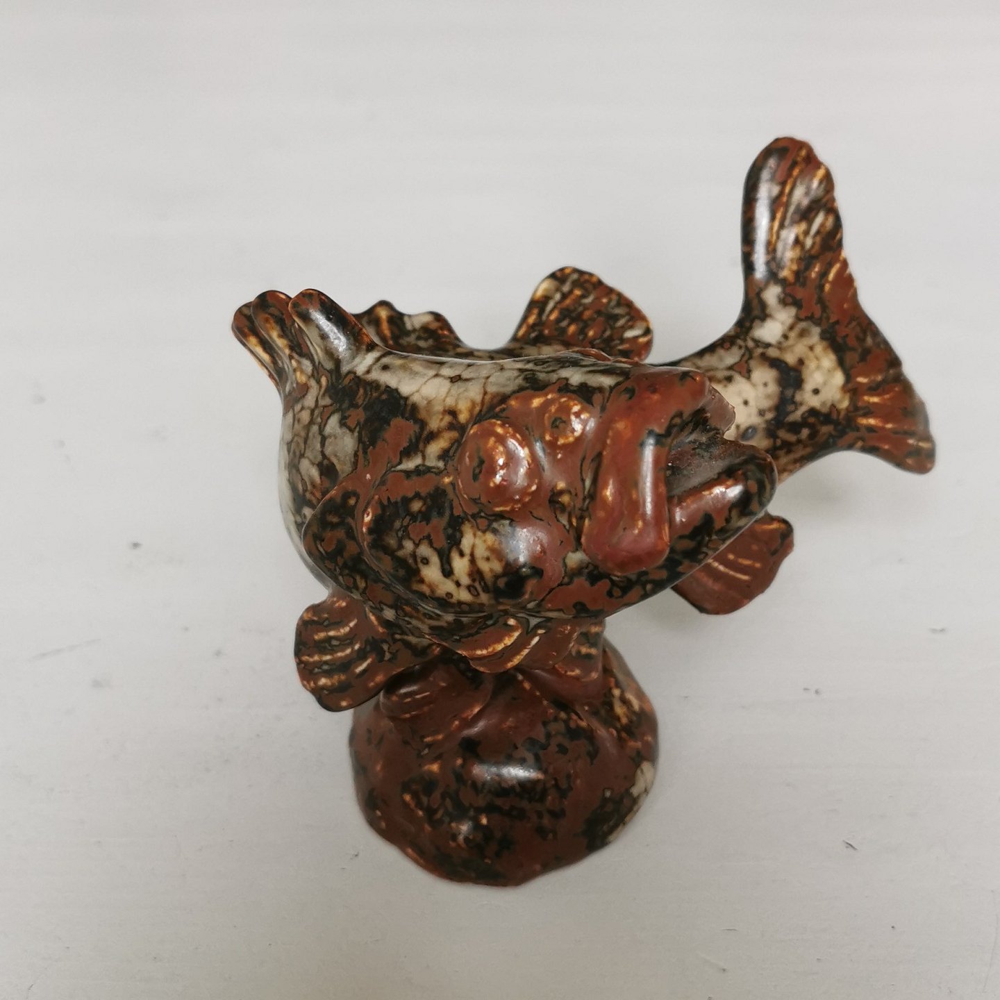 Figur af dragefisk i stentøj designet af Hugo Liisberg for Saxbo. Fremstår i perfekt stand uden skader eller reparationer. Kunstnersignatur HL på undersiden. Ikke fabriksmærket ! H. 10 cm.