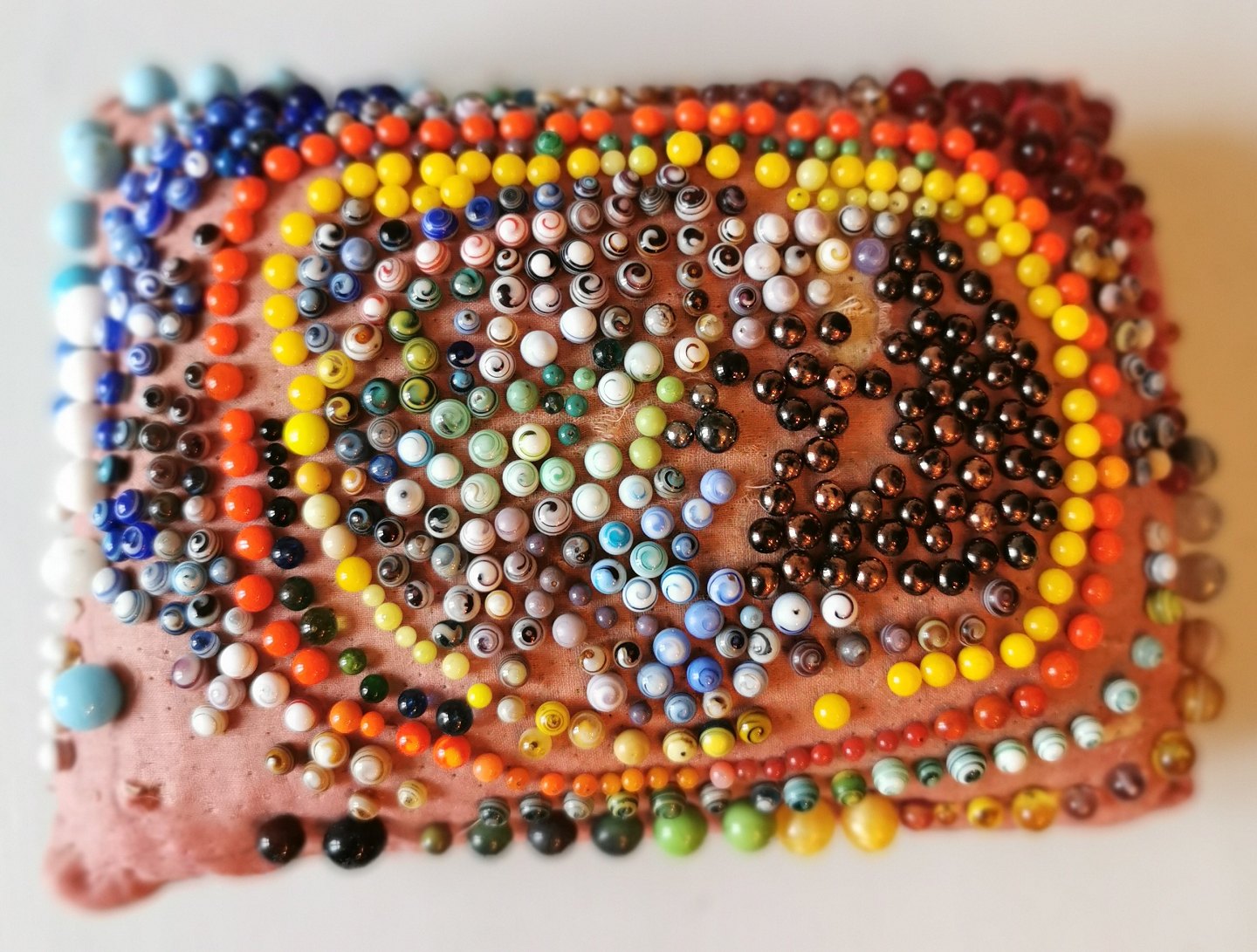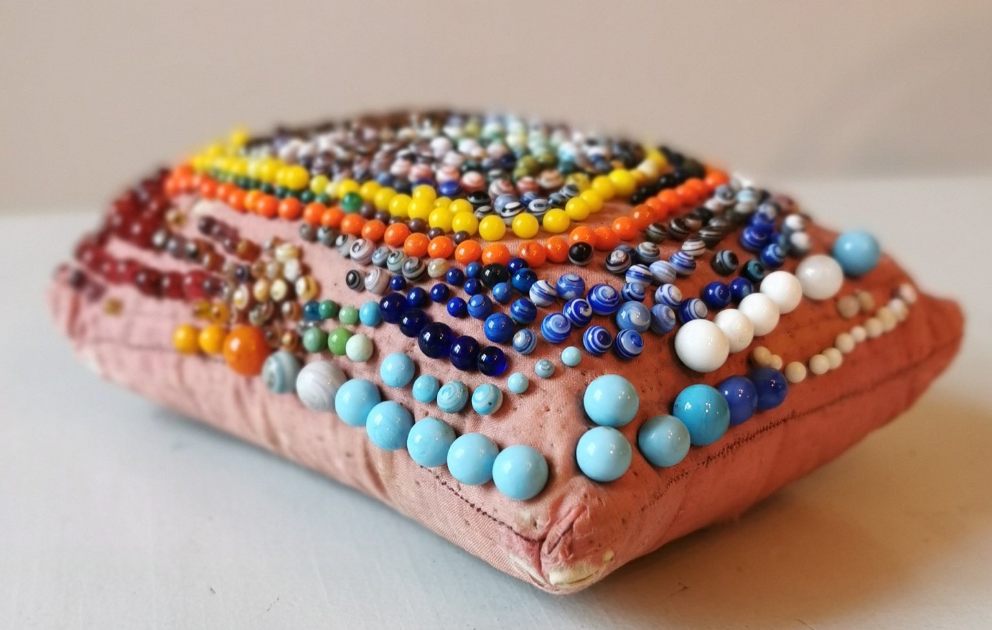 Gammel nålepude med mange gamle pyntenåle. Mål: H. 7½ cm L. 17½ cm B. 13 cm.