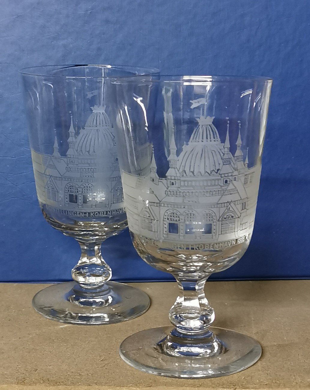 Par glas 19. århundrede fremstillet i anledning af Udstillingen i København 1888. Fremstår i perfekt stand. H. 13½-14 cm