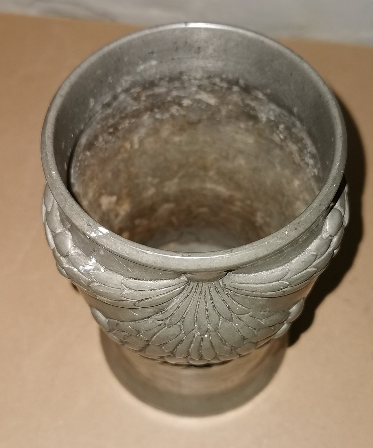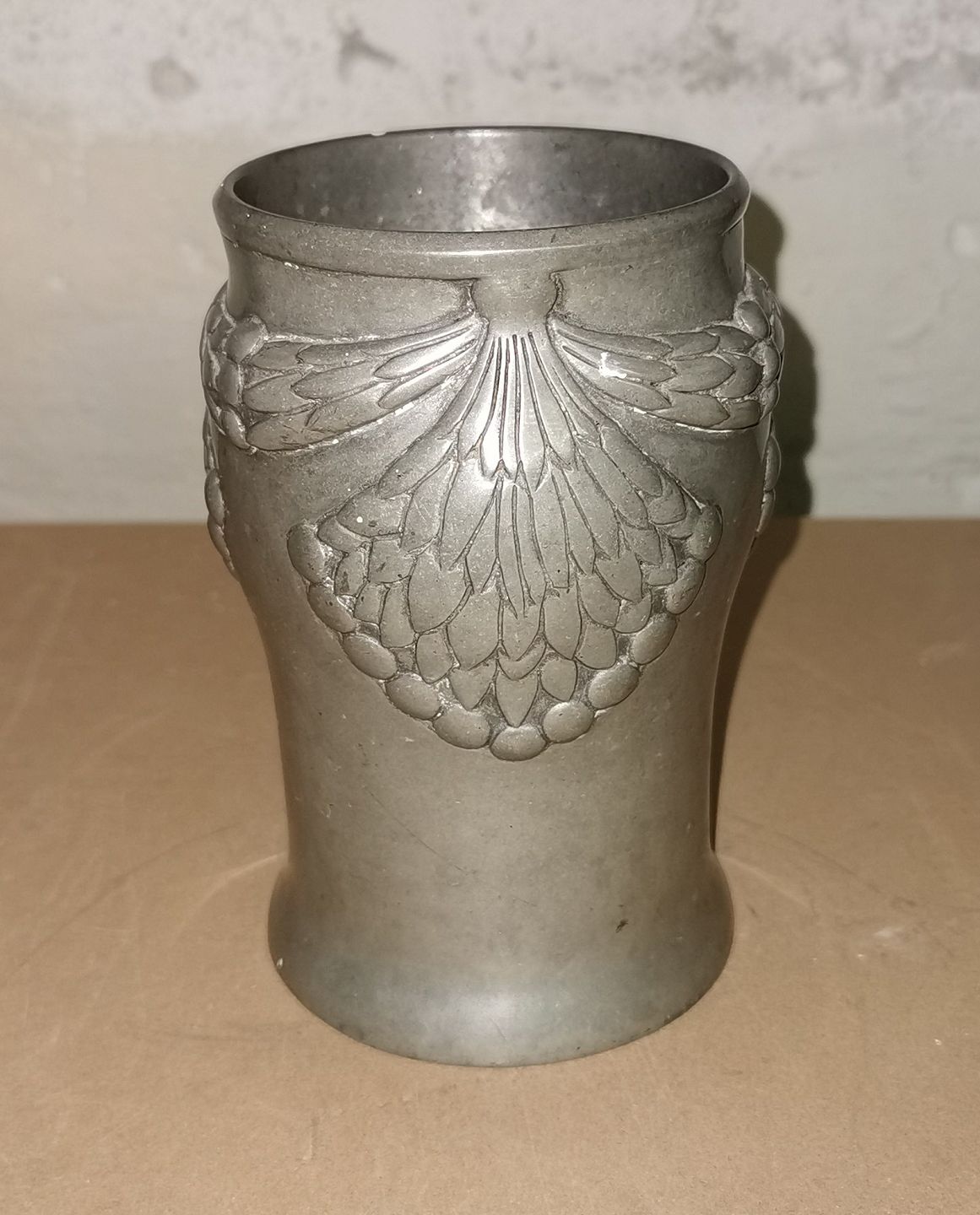Mogens Ballin´s efterfølger: Vase i tin med dekoration med guirlander af bladværk i relief. Fremstillet på Mogens Ballin´s Eftf.s værksted Hans Peter Hertz, der også arbejdede med sølv i samme periode. Fremstillet omkring 1920. Stemplet HPH samt modelnummer T 52. Fremstår i god stand uden skader eller reparationer. Almindeligt brugsslid efter brug. H. 15 cm.