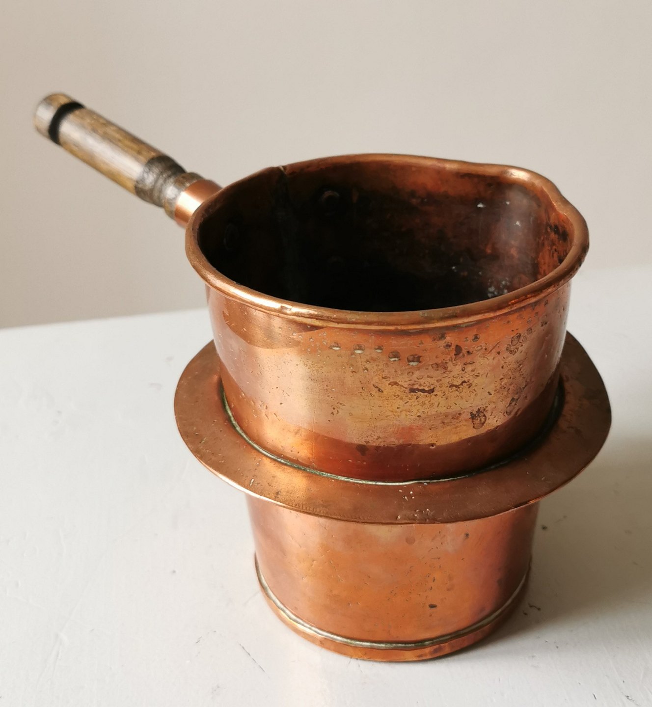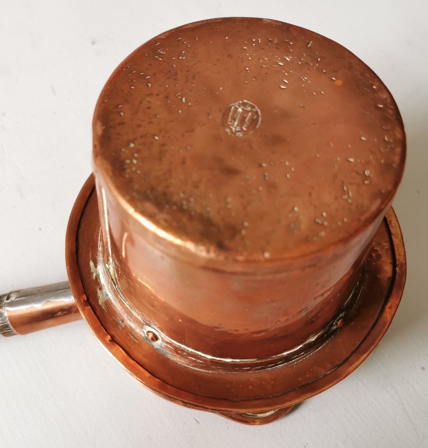 Kobbergryde med håndtag i træ. Fremstillet anden halvdel af 18. århundrede. I god stand uden skader eller reparationer. Stemplet på bunden. H. 12½ cm høj