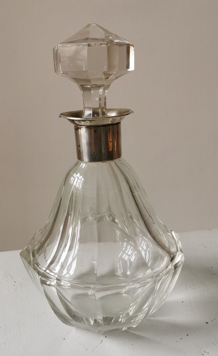 Glaskaraffel i krystal. Sølvmontering med dobbelt hældetud. Stemplet med tre tårne ! Fremstår i perfekt stand.