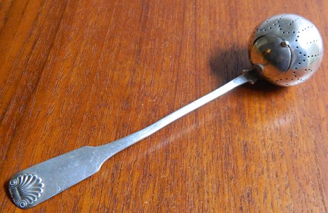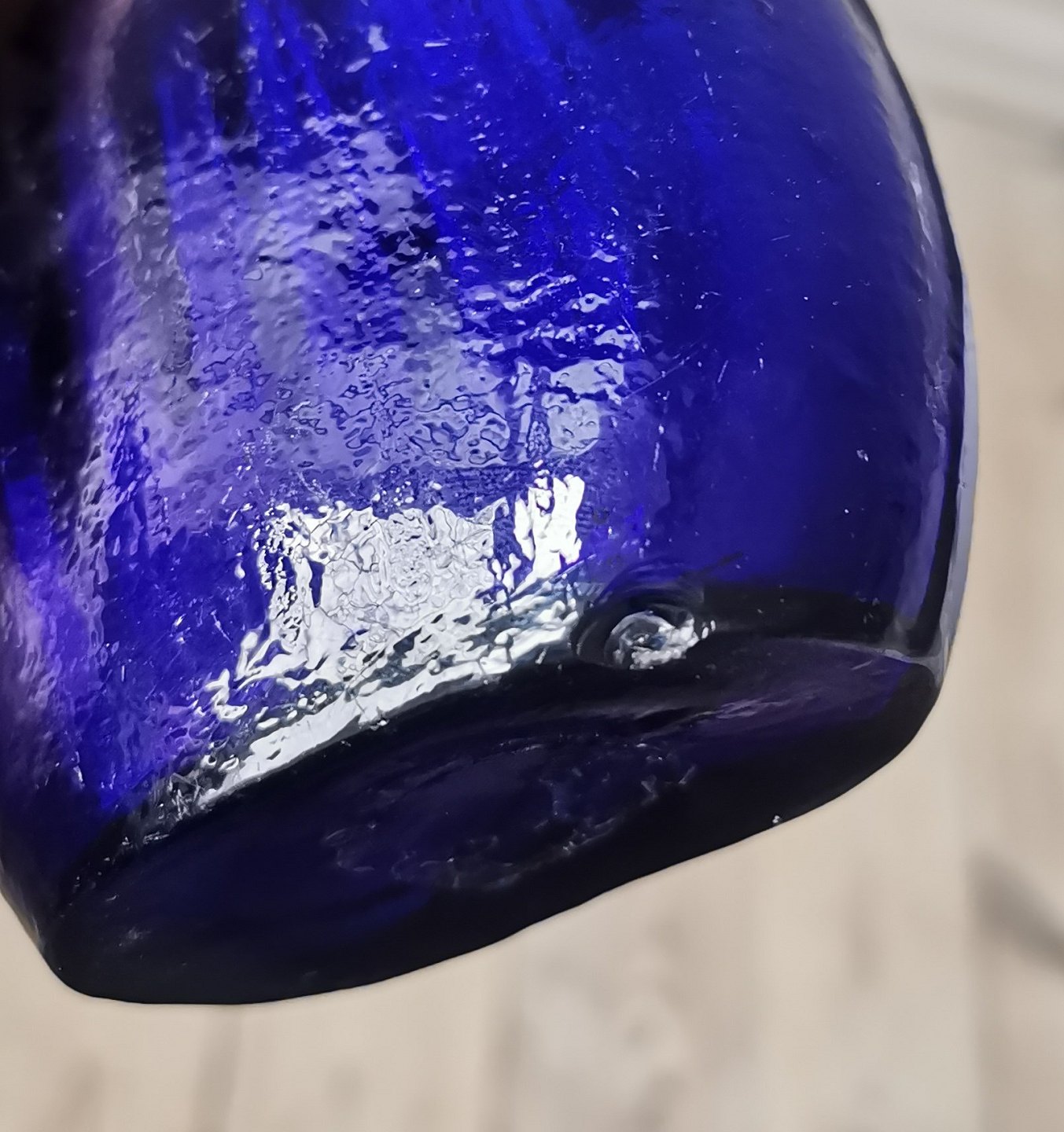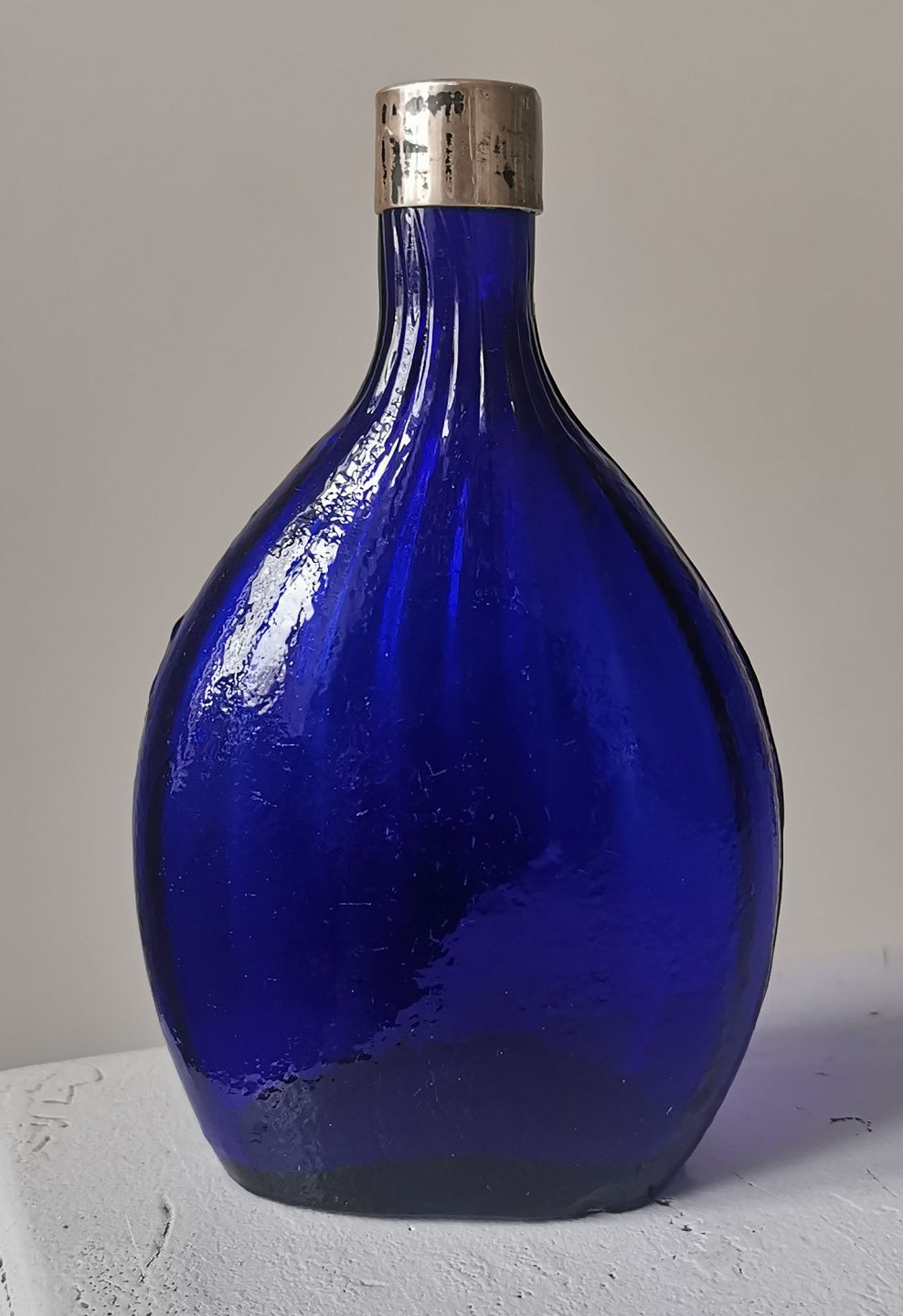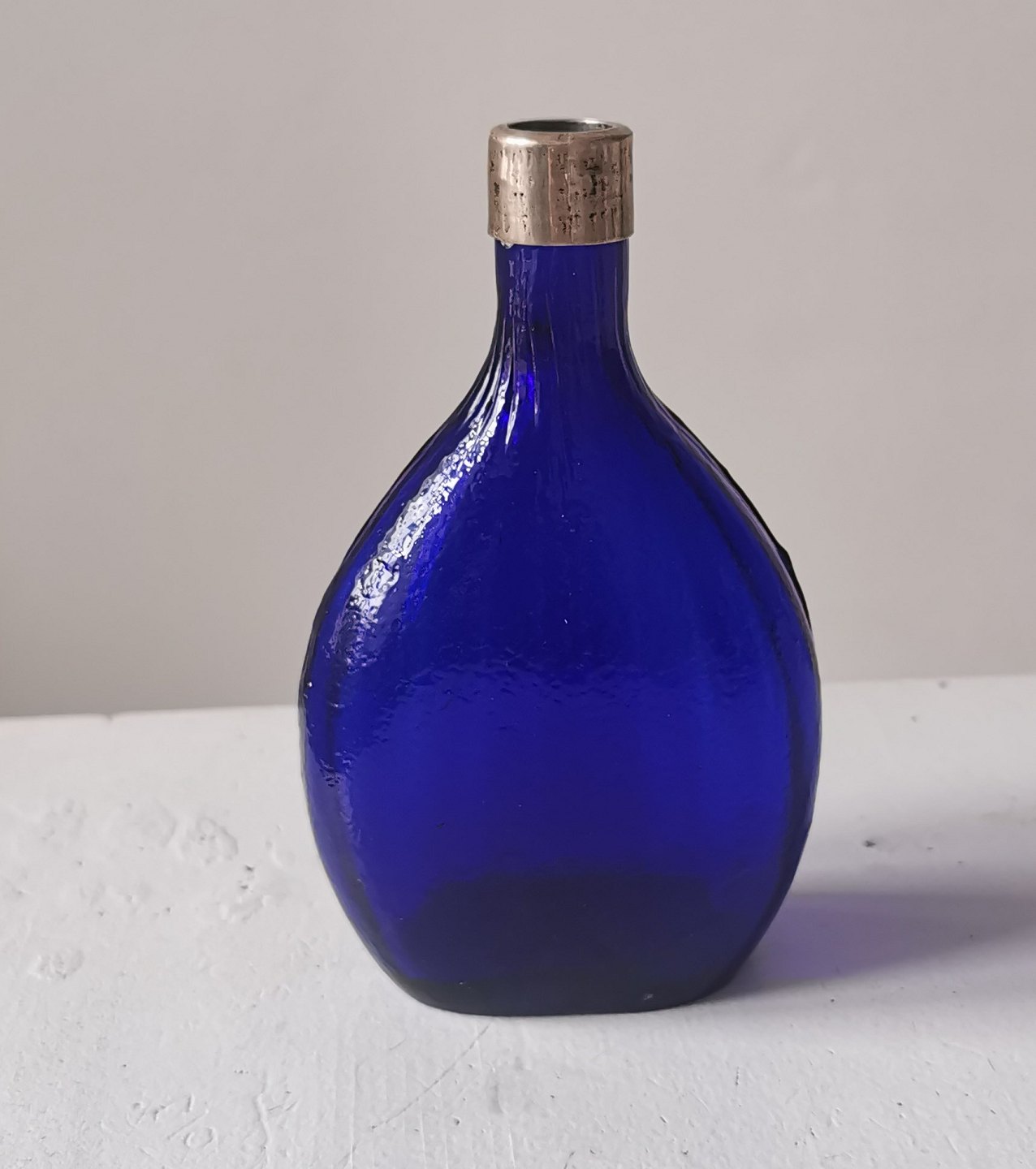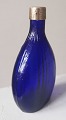 Antik lommelærke: Lommeflaske i blåt glas fra Holmegaard Glasværk anden halvdel af 19. århundrede. Monteret sølvtop, formodentlig grundet skade. Har endvidere skår på bundens kant. H. 15½ cm.