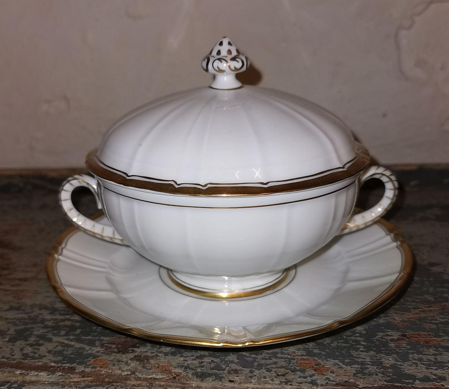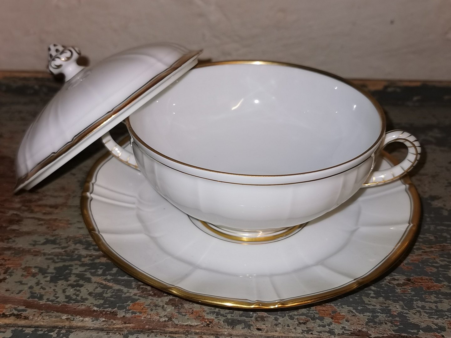 "Offenbach" suppe / bouillon kop, underkop og låg i porcelæn fra Bing & Grøndahl. 1. sortering. Fremstår i perfekt stand. Flere sæt haves. H. 12 cm incl. låg. Underkop diameter 17½ cm.