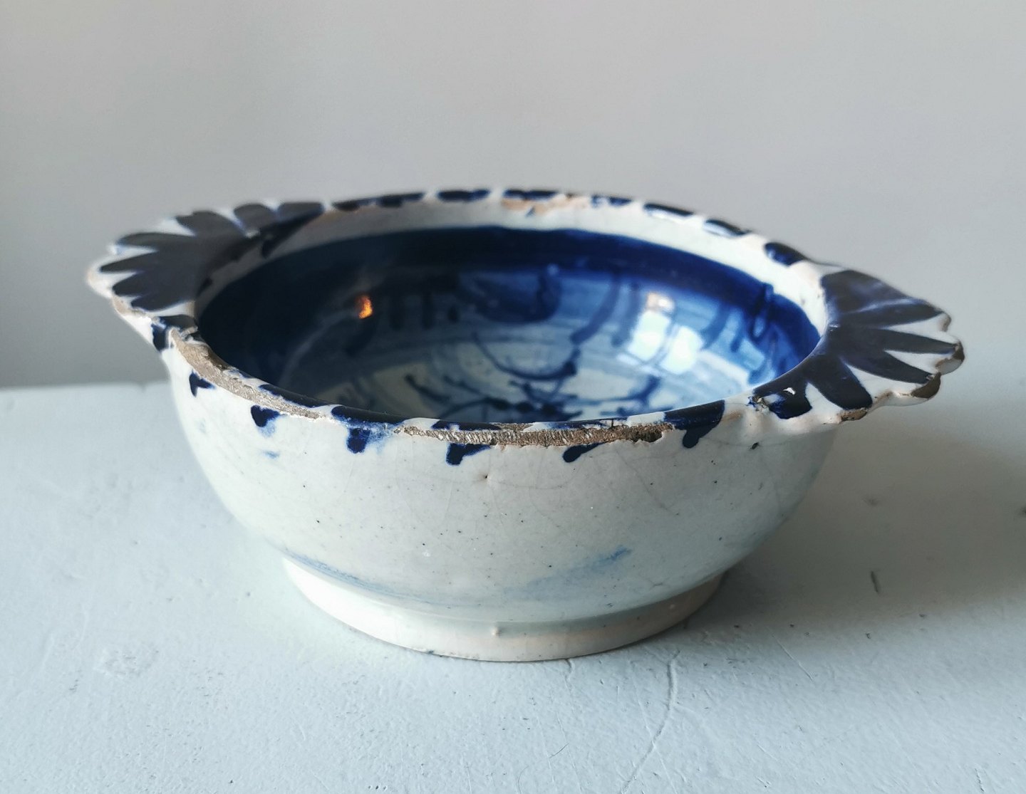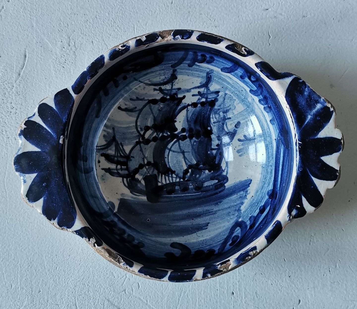 Charmerende øreskål i fajance med dekoration af sejlskib i bunden af skålen. Almindeligt brugsspor på kanten. Ingen skader eller reparationer. Formodes fremstillet Mellemeuropa. H. 5 cm Fra øre til øre: 15 cm.