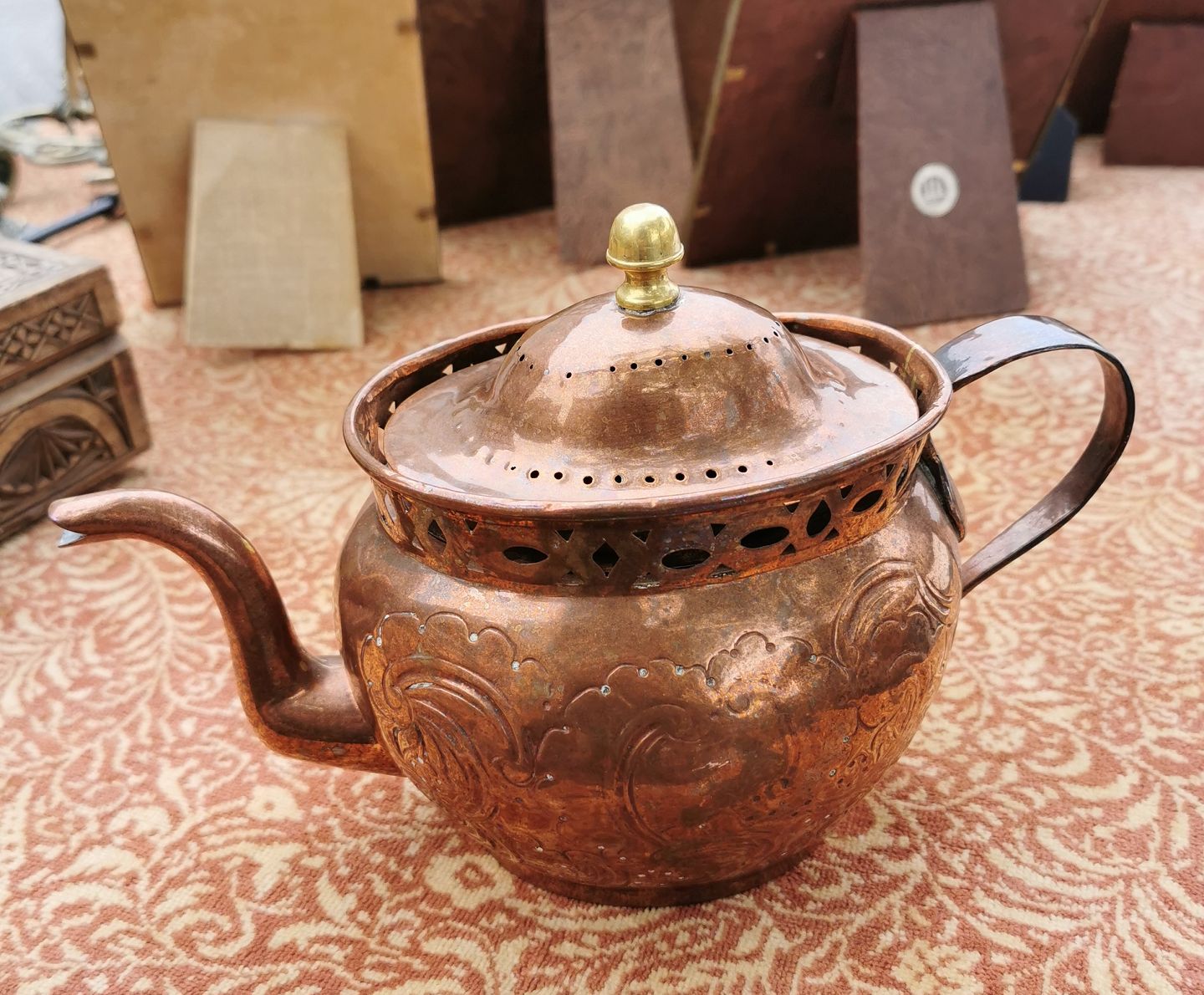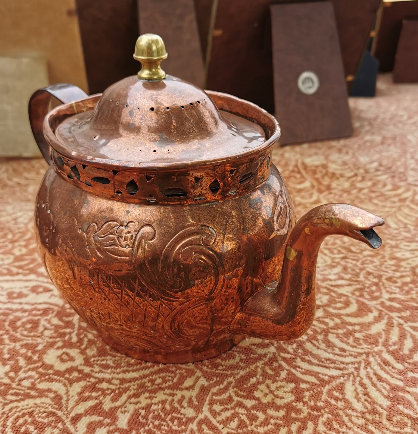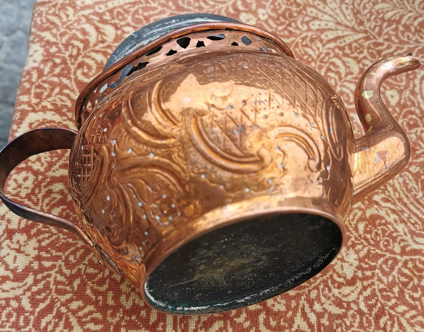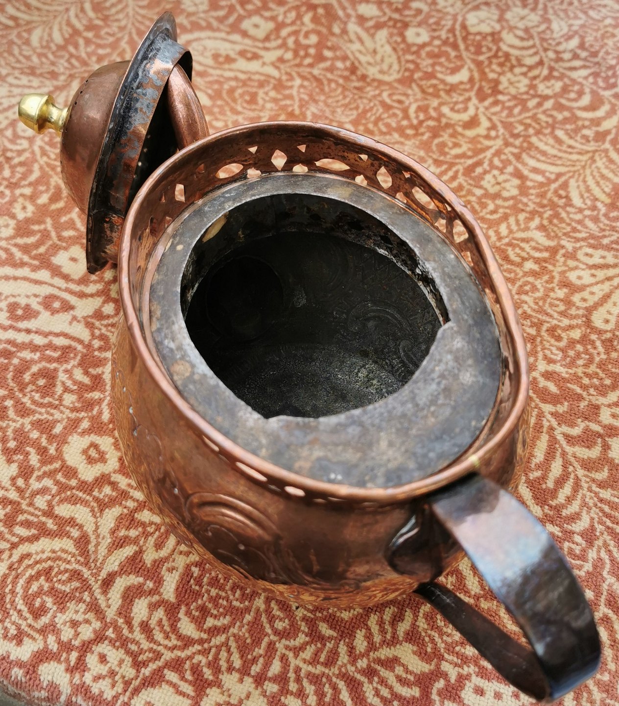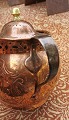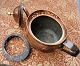 Kande i kobber med rokoko dekoration på siden samt gennembrudt dekorativ kant. Formodes fremstillet omkring 1800. I god stand. Mål: 16 cm høj og 26 cm lang.