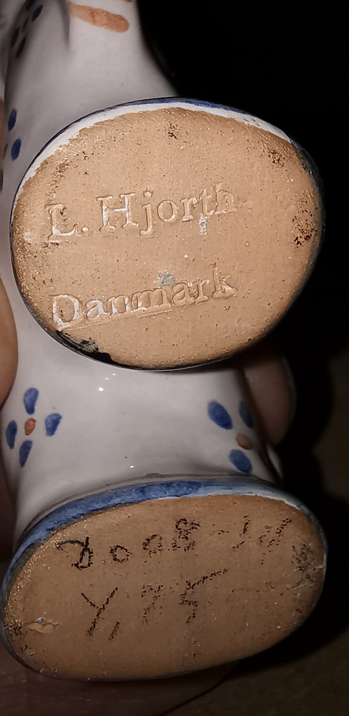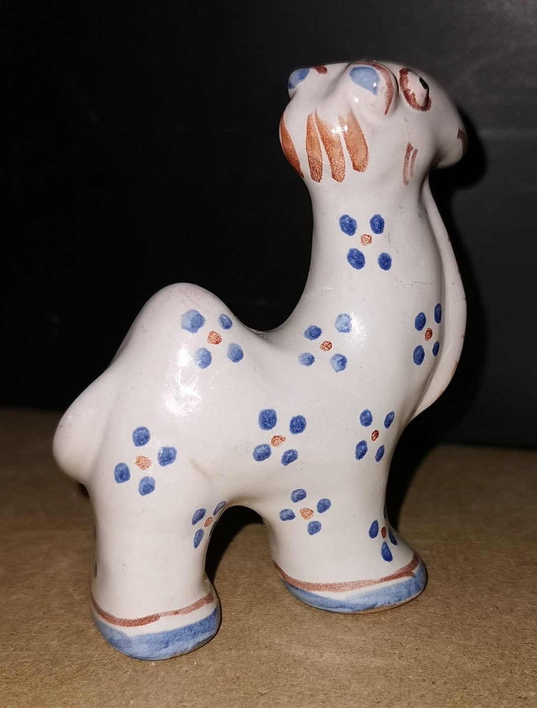 Lauritz Hjorth fabeldyr i form af dromedar. Hvid med plettet dekoration. Mindre glasurmangel på venstre bagben (se foto). Fabriksmærket på bunden. Ingen reparationer. H. 8 cm.