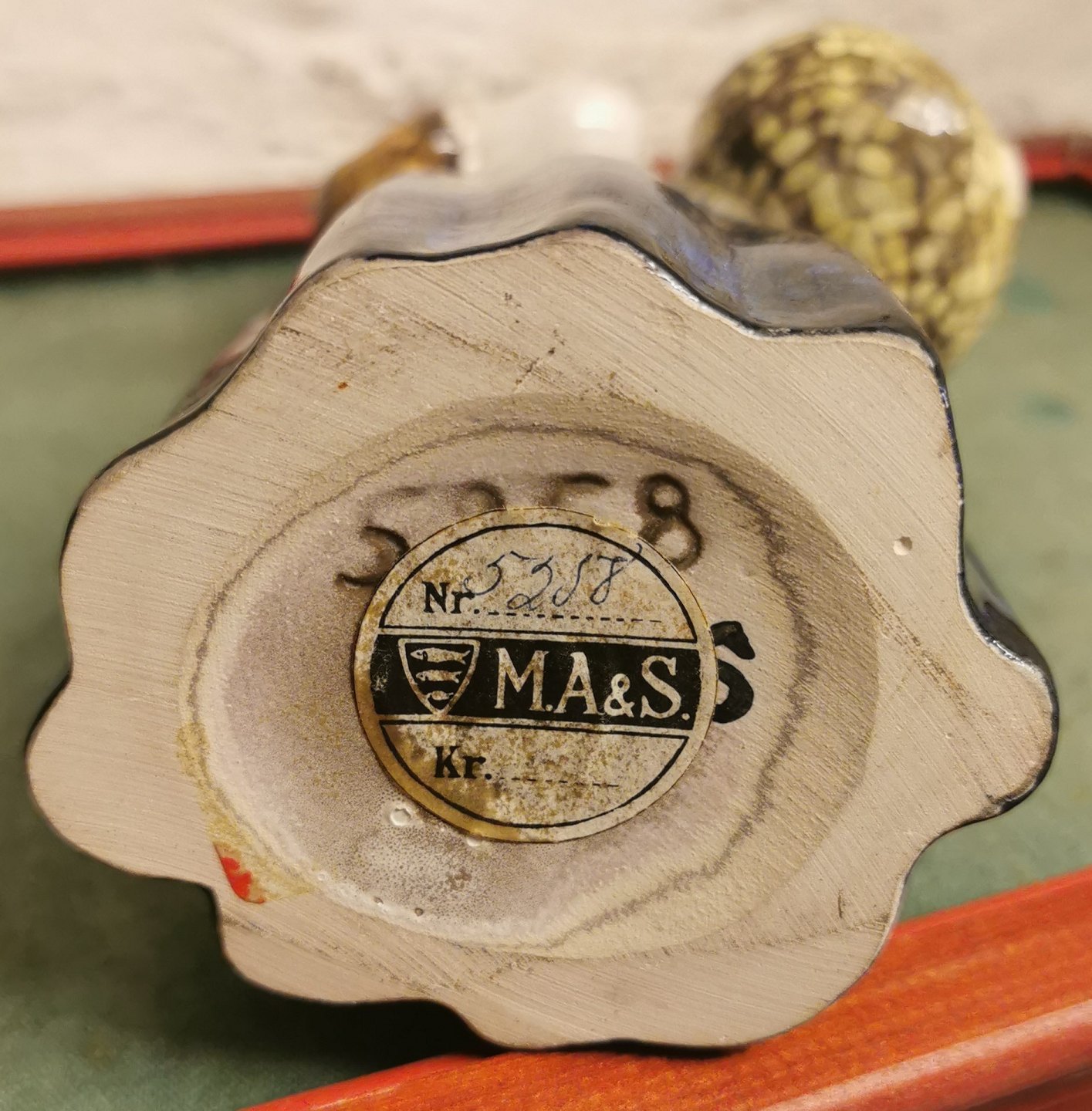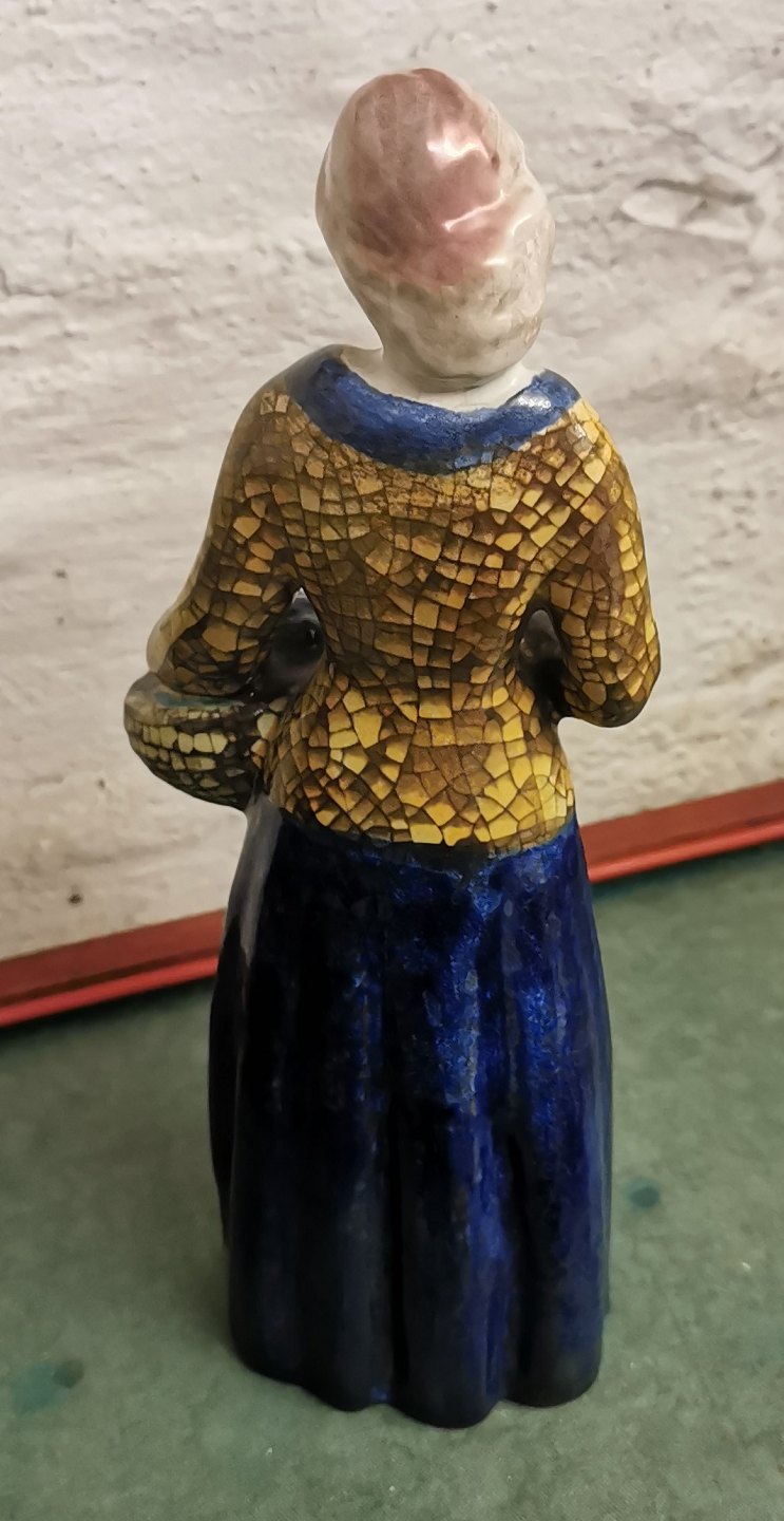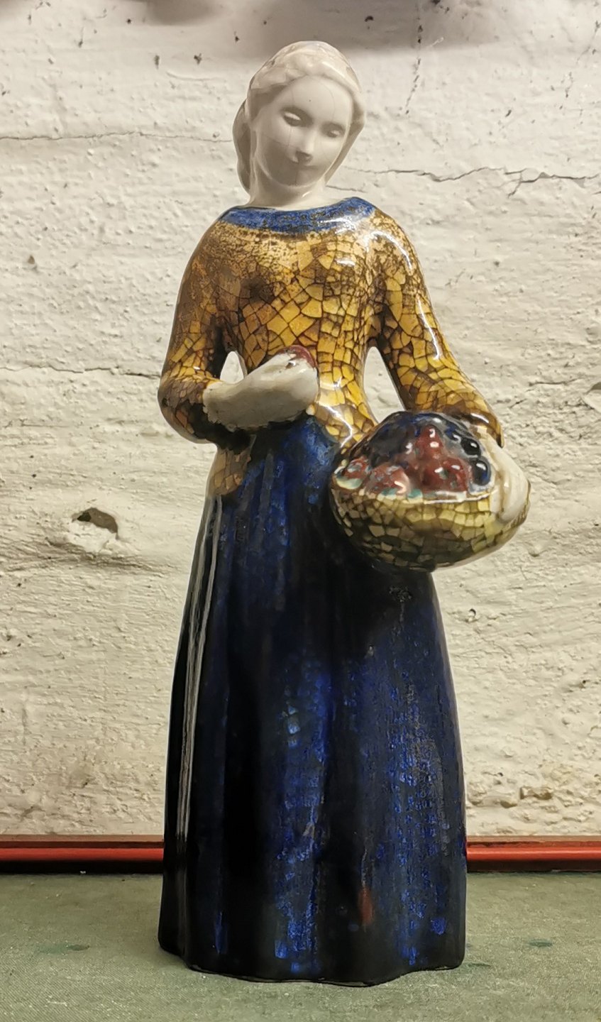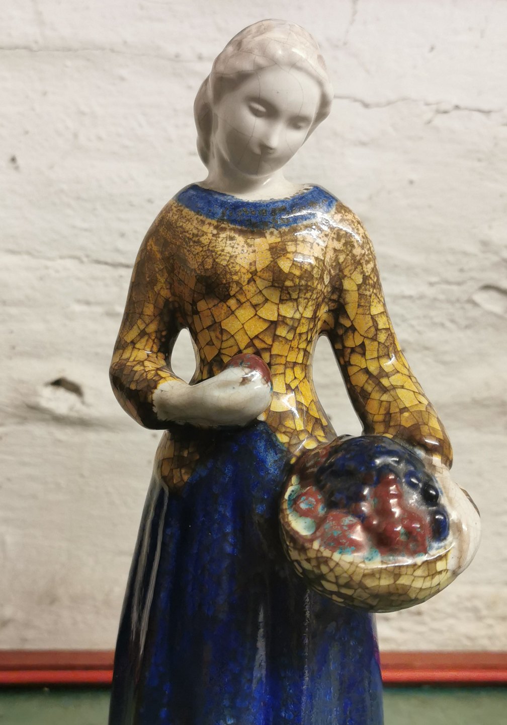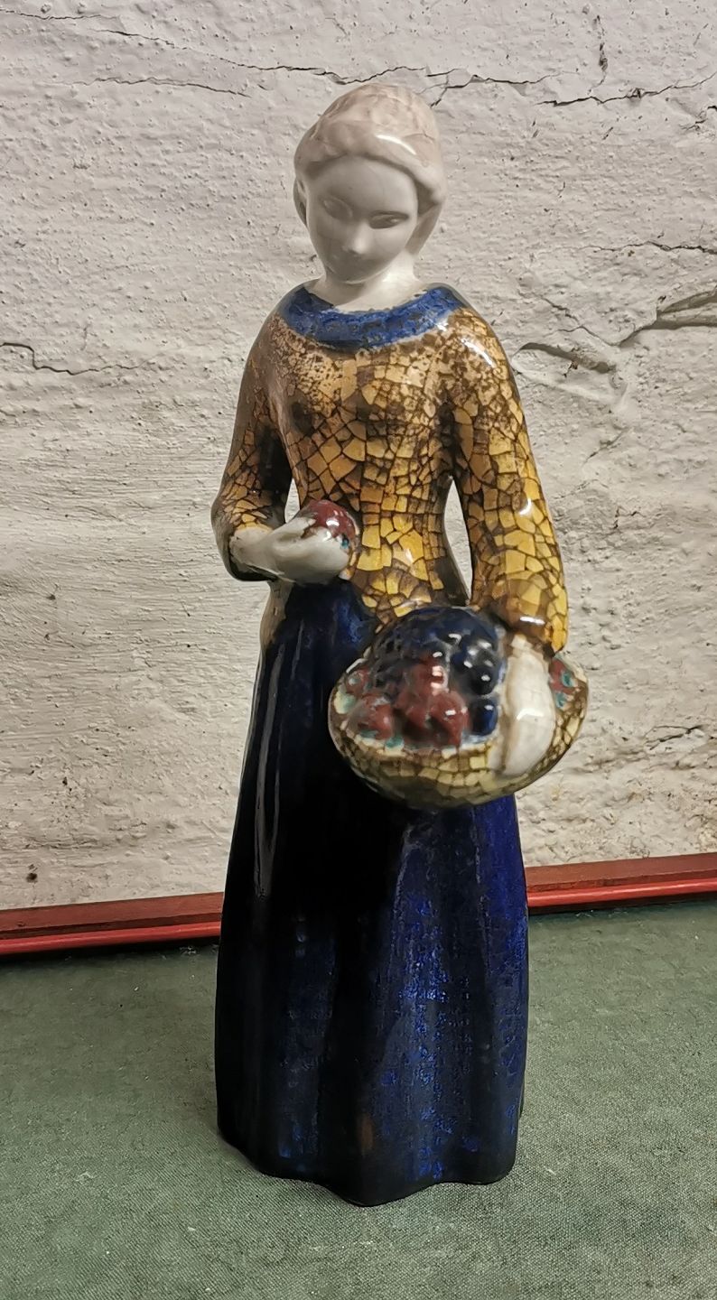 Figur af ung kvinde med frugtkurv fra Michael Andersen & Søn. Delvist krakkeleret glasur. Fremstår i god stand uden skader eller reparationer. Fabriksmærket på bunden. H. 24 cm