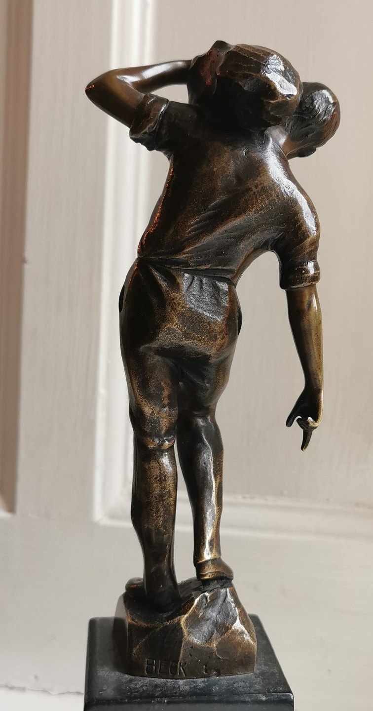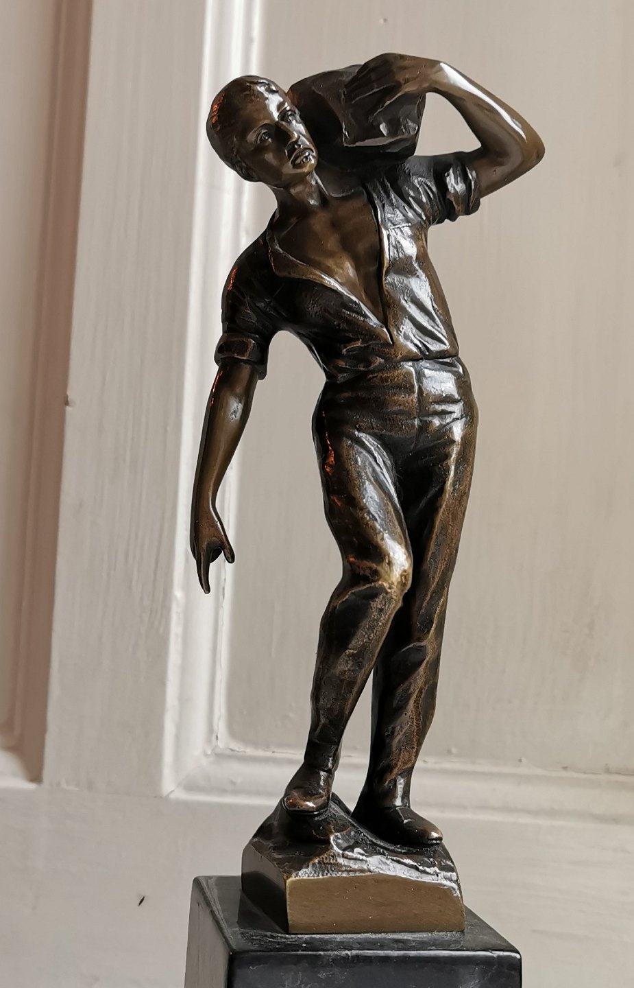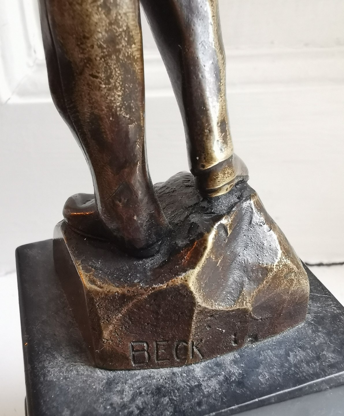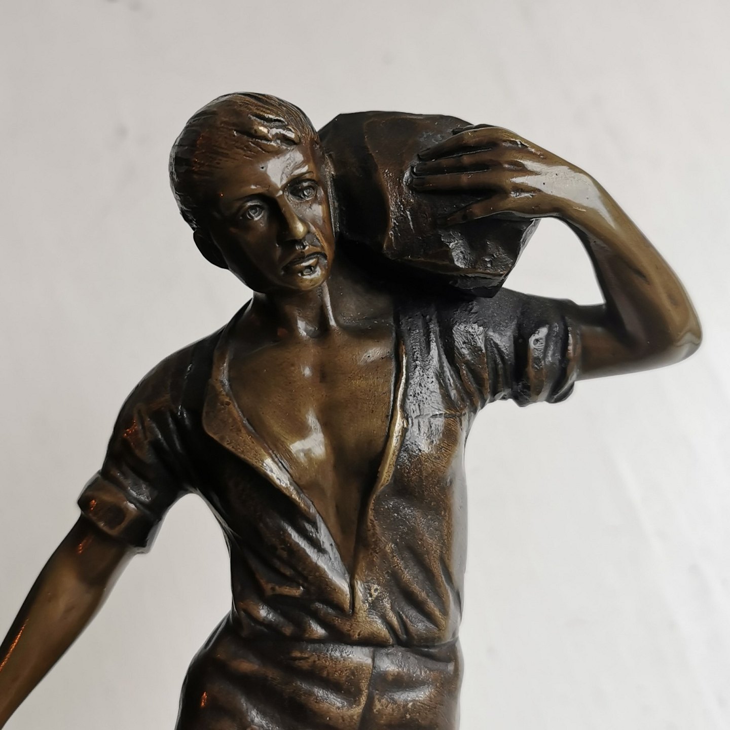Bronze figure on stone plinth depicting man / worker carrying on a stone on his shoulder. Signed by the Austrian sculptor Ernst Beck (1879-1941). In good condtion. No damages or repairs. H.: 27 cm incl. the base.