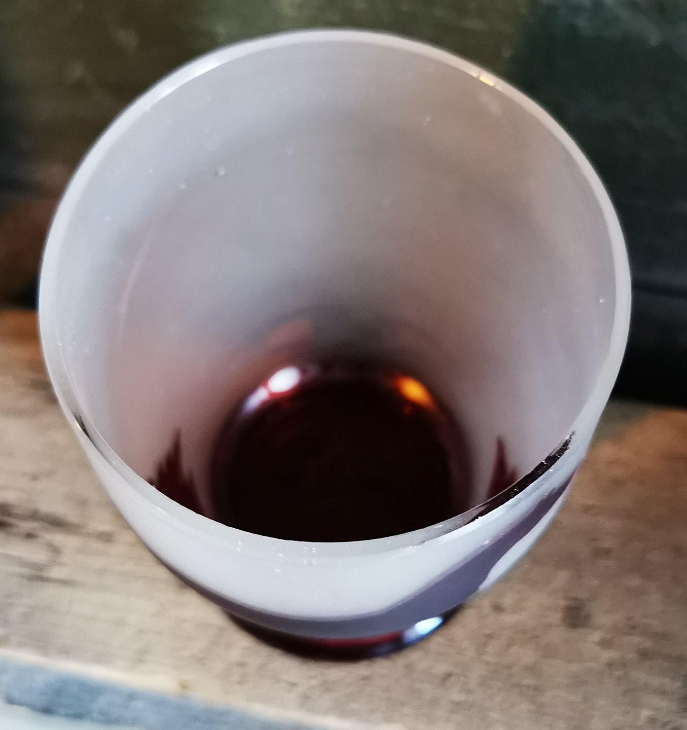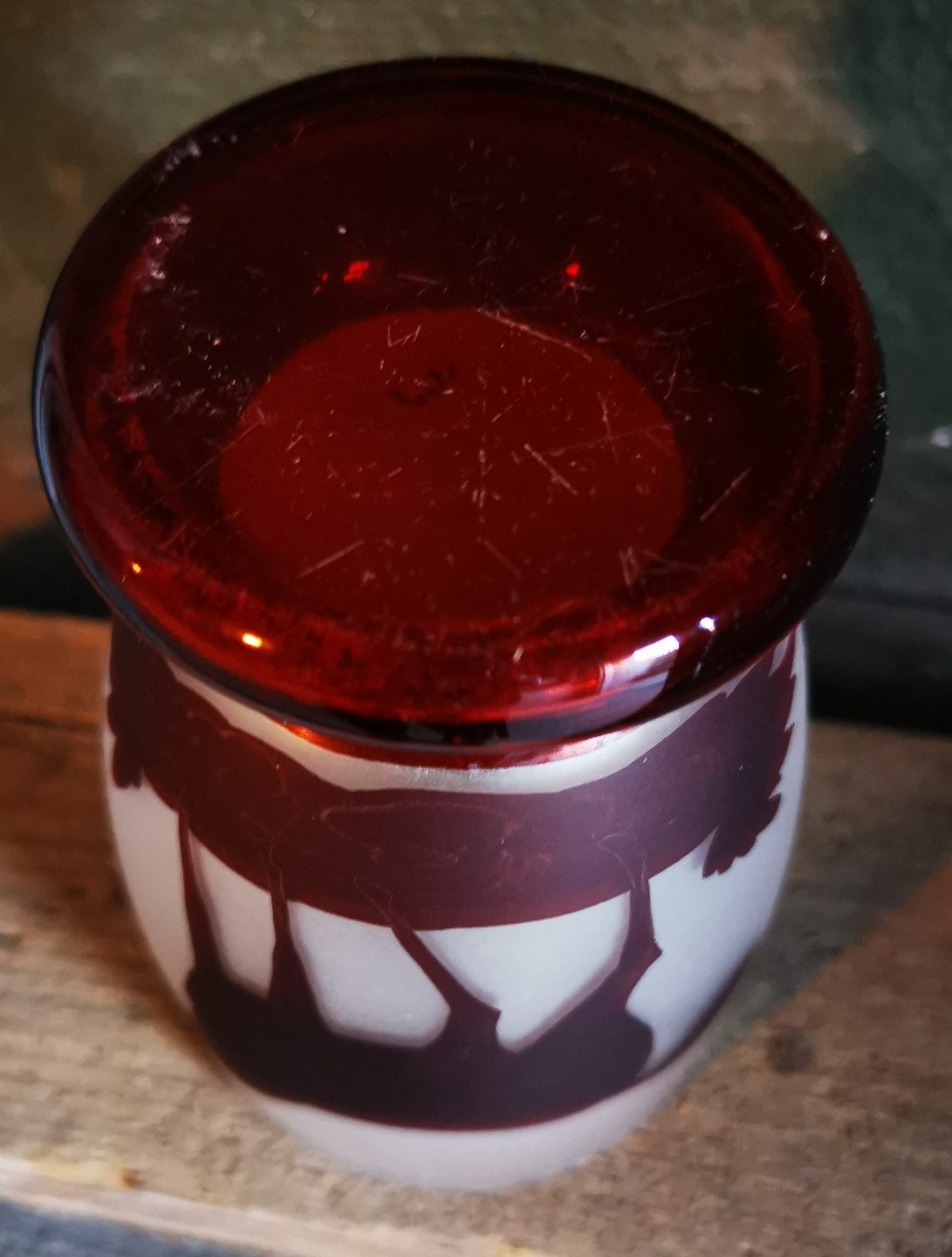 Matteret drikkeglas med dekoration af stående hest. Denne og bunden bordeaux. Fremstillet i anden halvdel af 19. århundrede. I god stand uden skader eller reparationer. H. 12 cm.