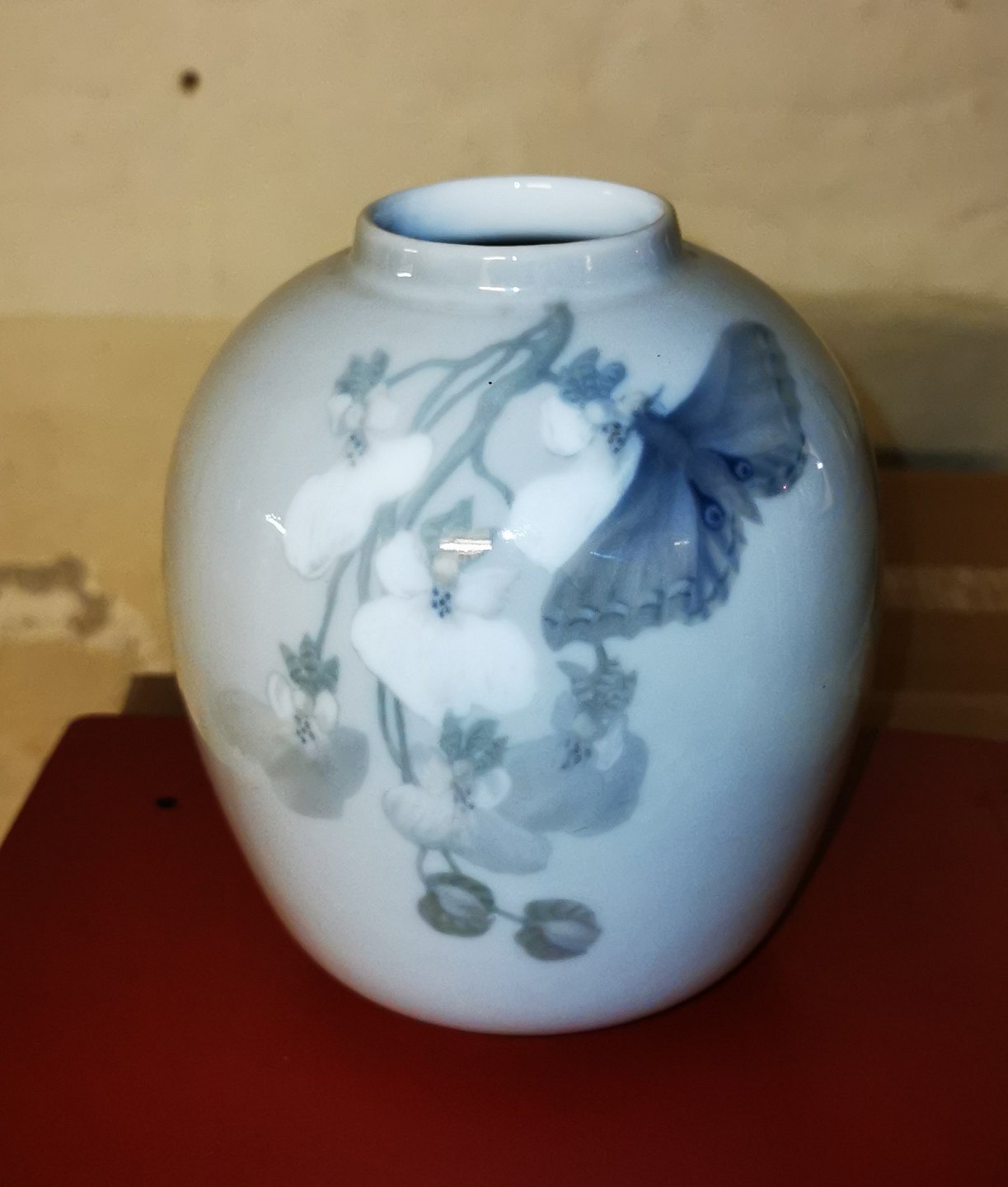 Vase i porcelæn med dekoration af gren med blomster samt sommerfugl. Fremstår i god stand uden skader eller reparationer. Fremstillet mellem 1900-1923. Fabriksmærket på bunden. 1. sortering. Mål: H. 17½ cm.