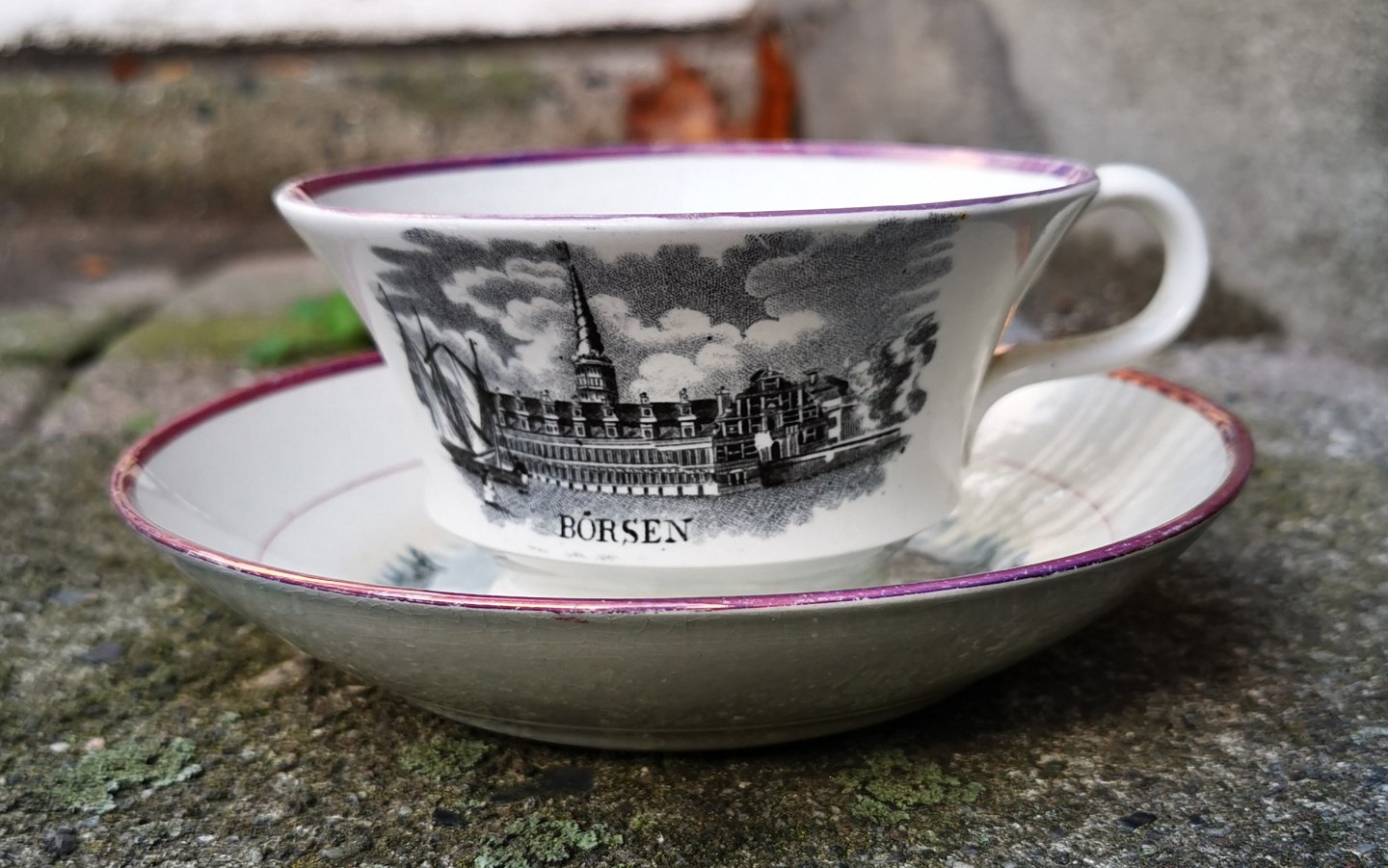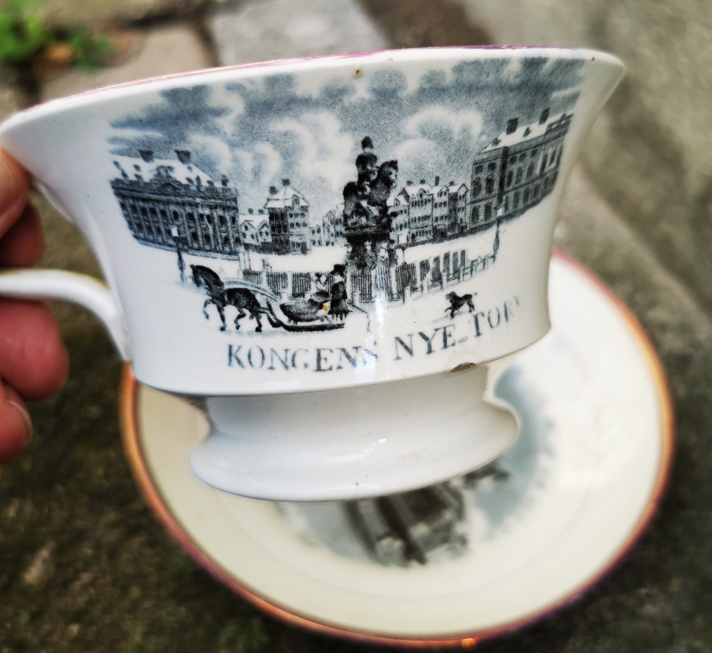 Meget stor morgenkop i fajance med københavnske motiver. Rosenborg Slot, Kongens Nytorv samt Amalienborg i bunden af underkoppen. Fremstår i god stand. Fabriksmærket (et indtrykt anker) på bunden. Mål: Koppen er 7 cm høj og åbningens diameter er 12-12½ cm. Underkoppen er 4 cm høj og har åbningsdiameter på 18½ cm.