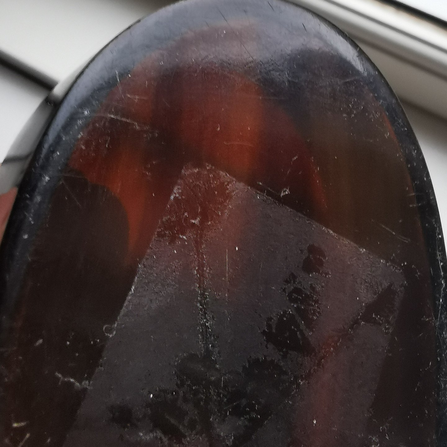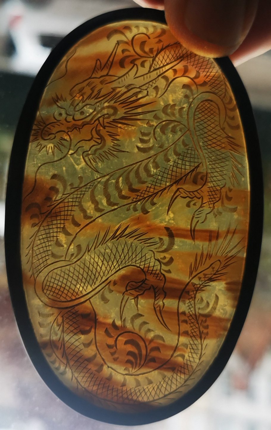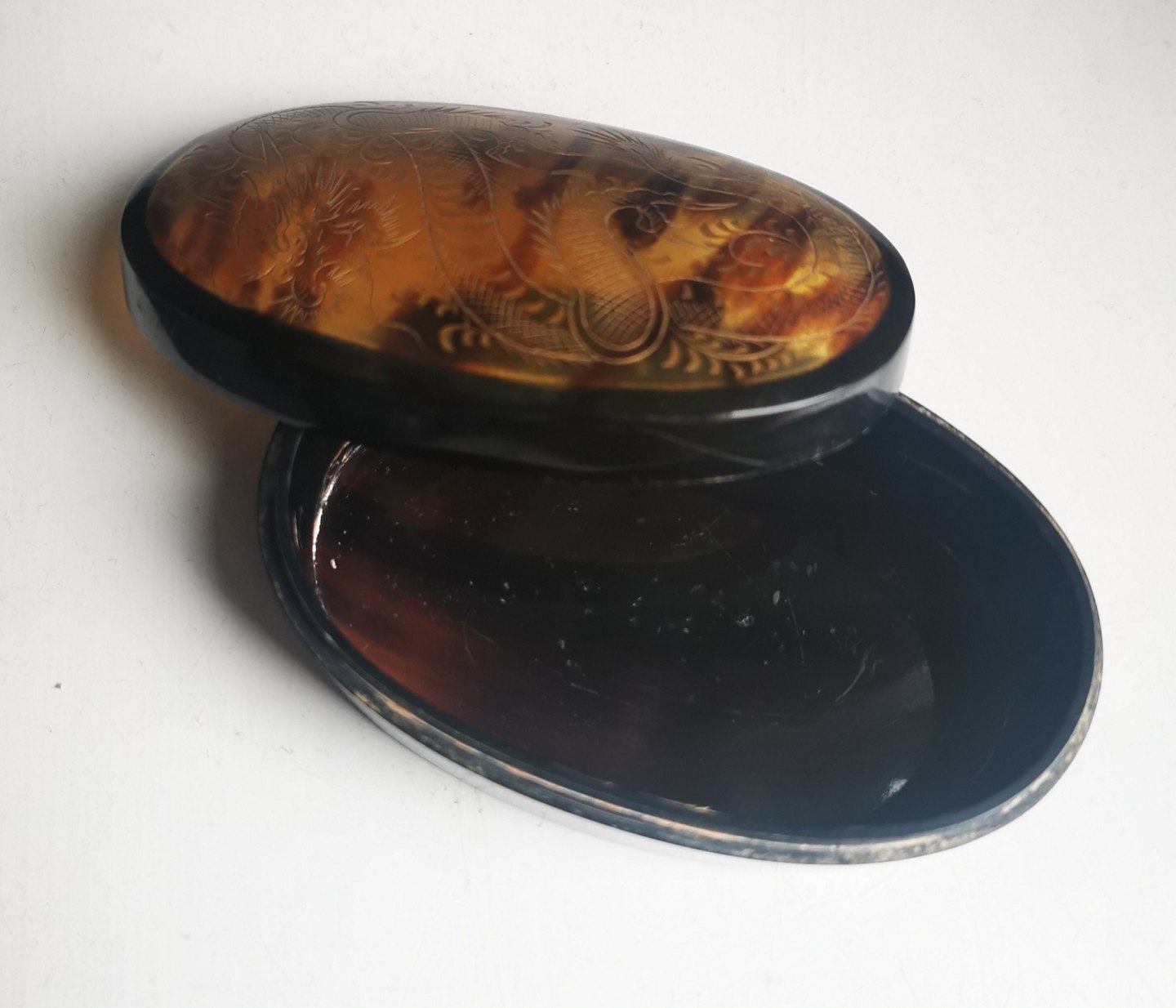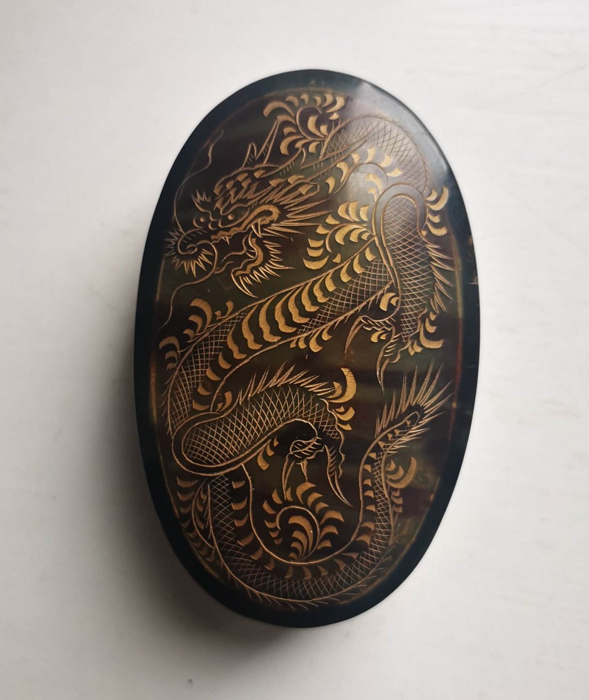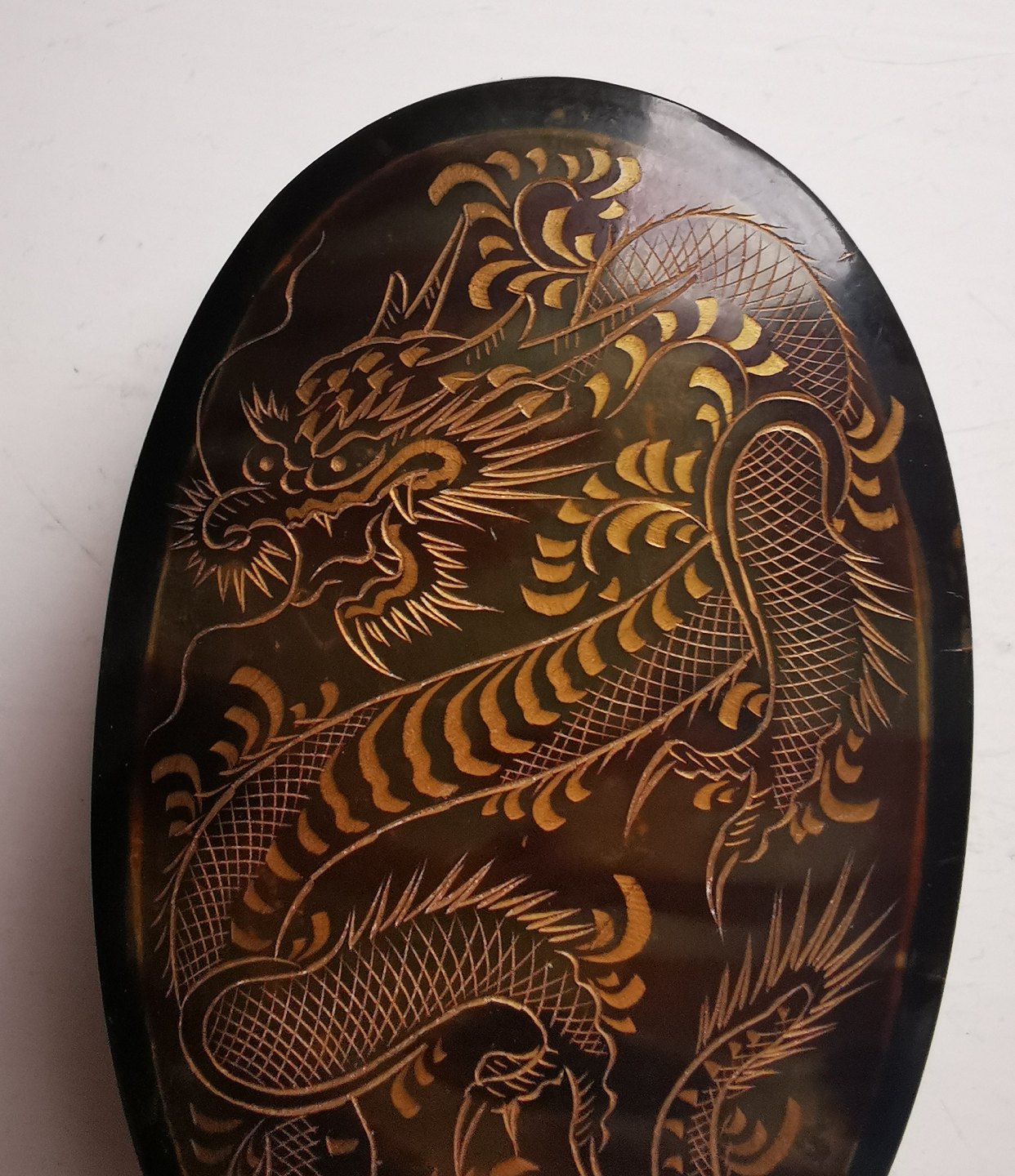Lågæske med dekoration af drage. Udført i skildpaddeskjold. Formodes fremstillet i Kina omkring 1920. Rester af "klister" fra prismærke på bunden. Mål: H. 3½ cm L. 9½