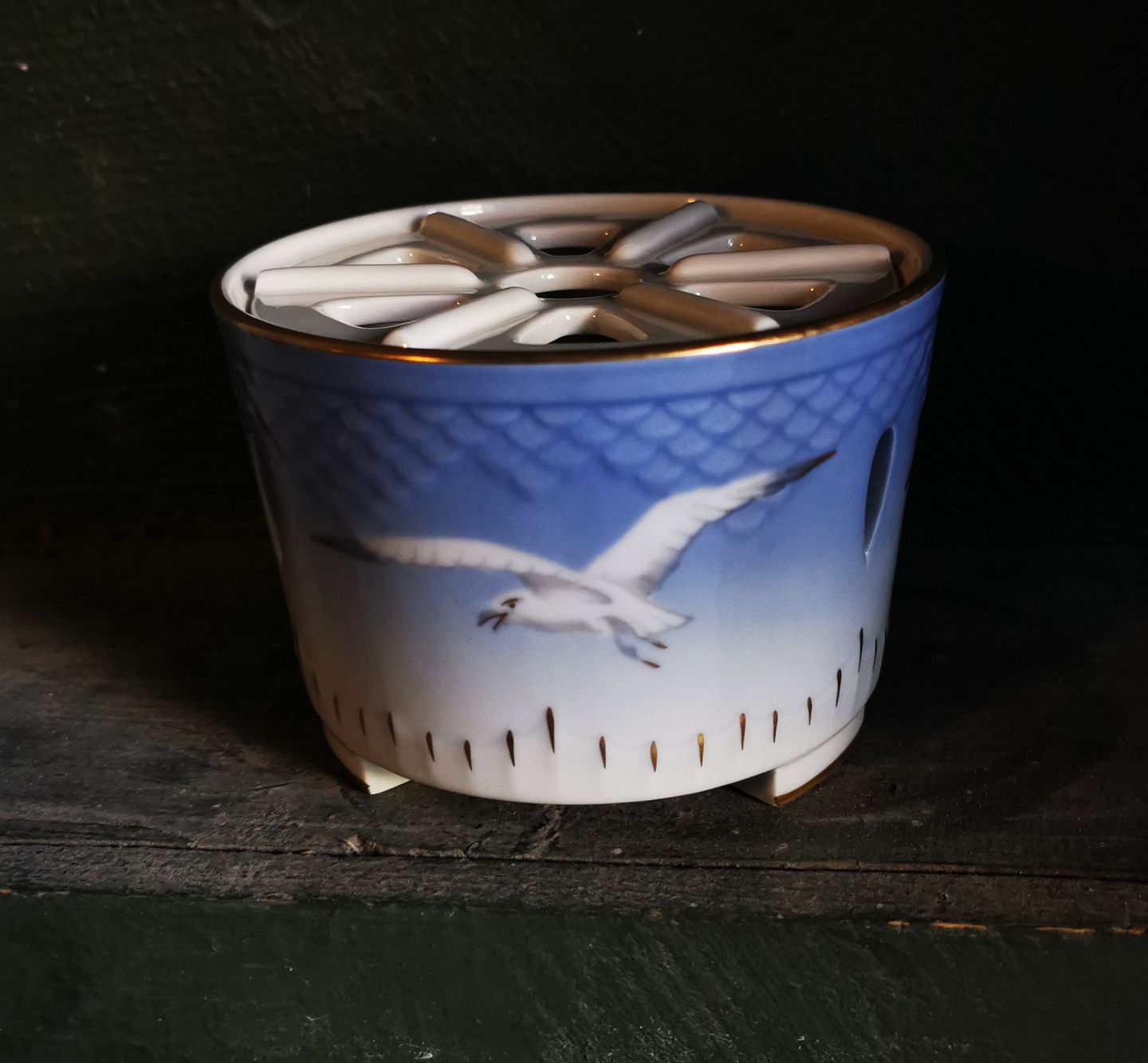 Bing & Grøndahl varmer i porcelæn fra Mågestellet. Risten med hårrevne ! Ellers 1. sortering. Fabriksmærket på bunden. Mål: H. 8½ cm Ø.: 12 cm.
