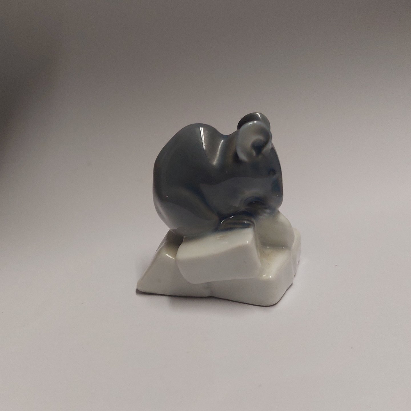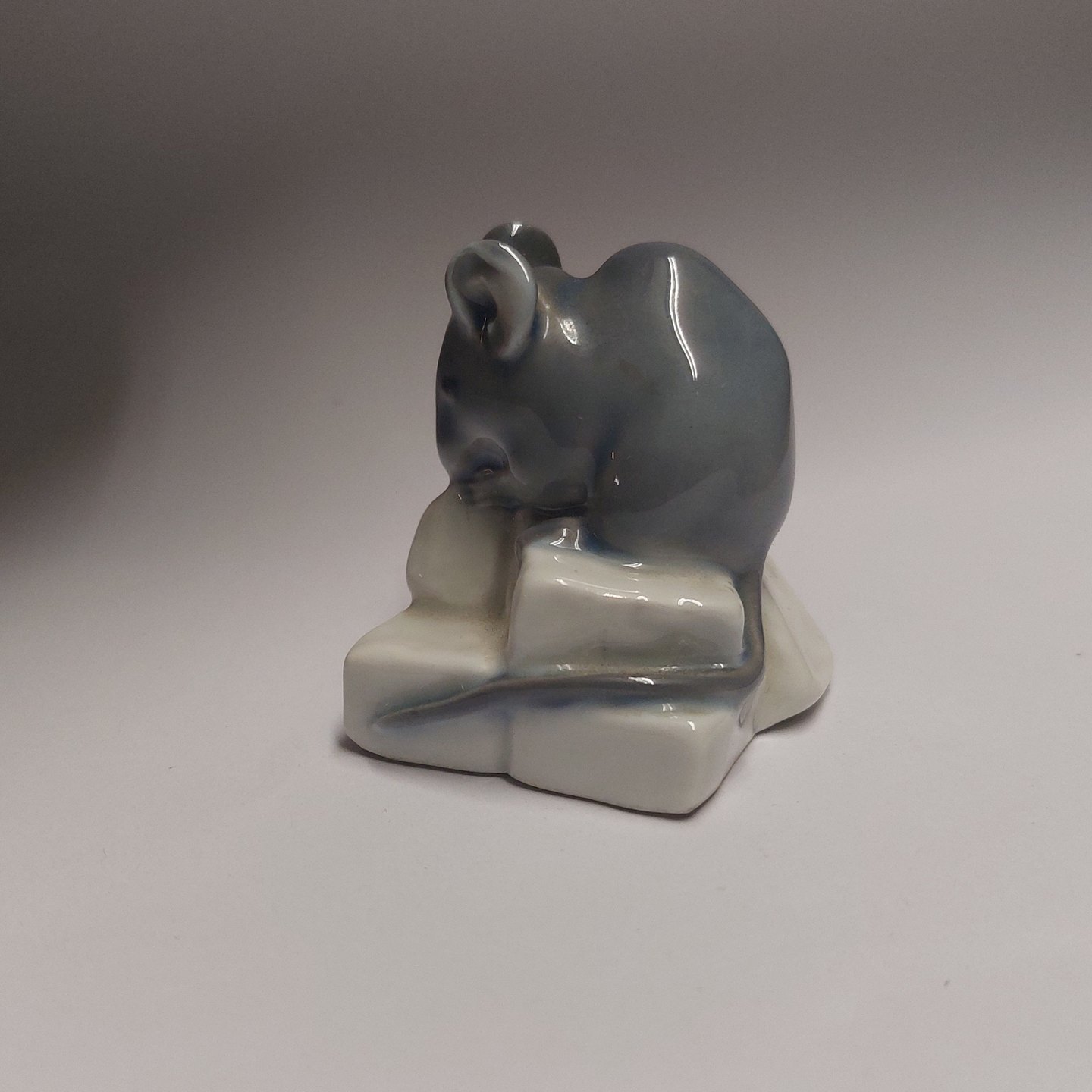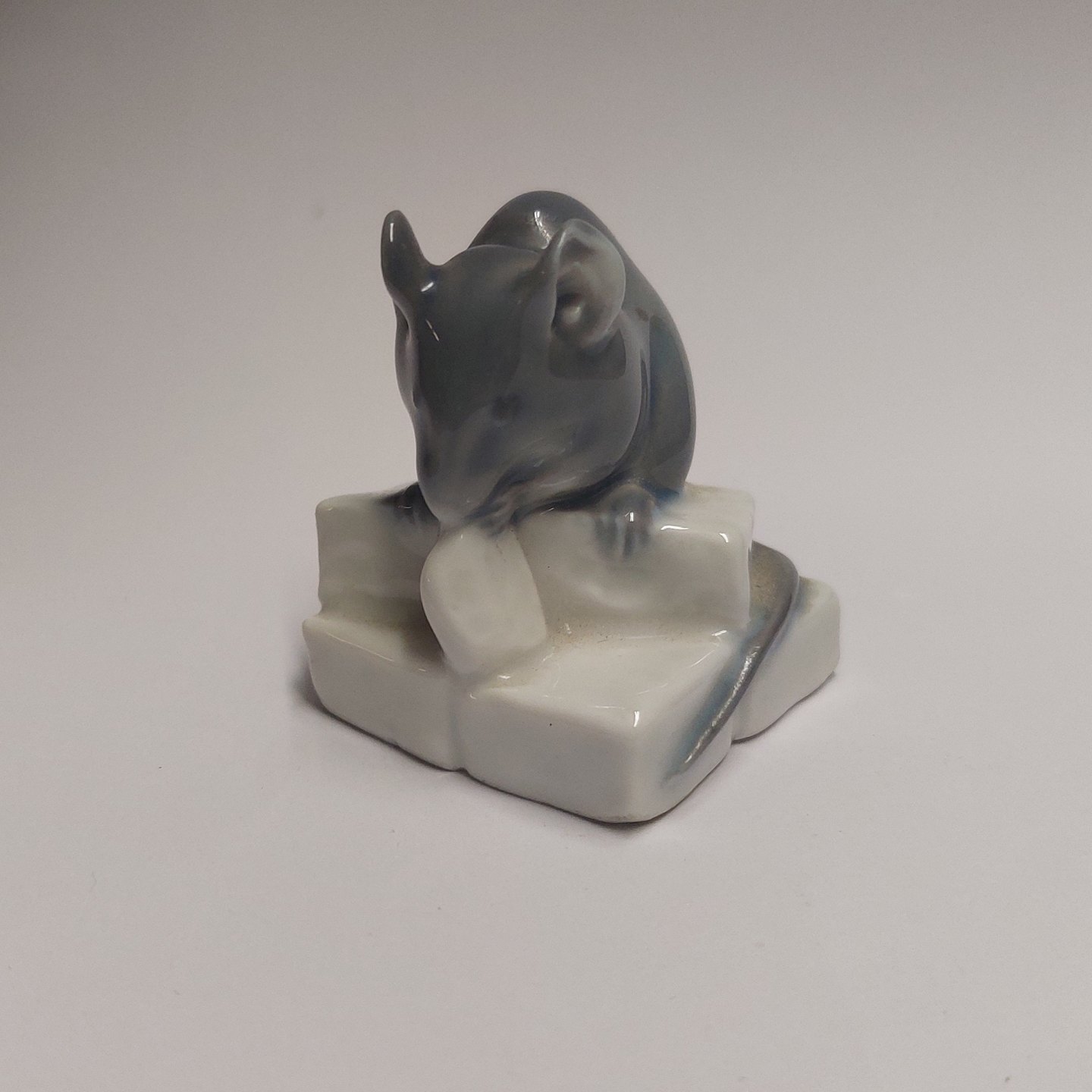 Figur af mus på sukkerstykke eller sukkerknald. Produceret hos Royal Copenhagen. Modelnummer 510. Designet af Erik Nielsen. Fabriksmærket på bunden. 1. sortering. Ingen skader eller reparationer. H. 4 cm.