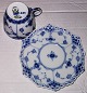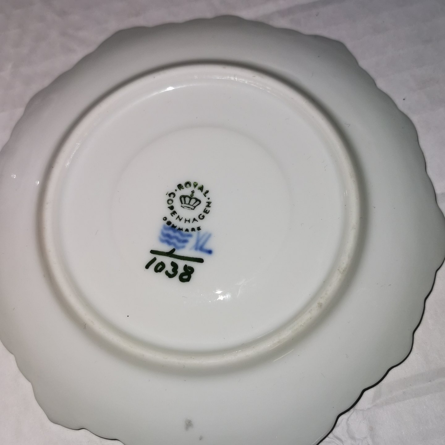 Royal Copenhagen kaffekop med underkop i musselmalet porcelæn. Fremstår i god stand. 1. sortering. Modelnummer 1038. Mål: Koppen er 5½ cm høj (2.16 inches) og underkoppen er 12 cm i diameter (4.72 inches).