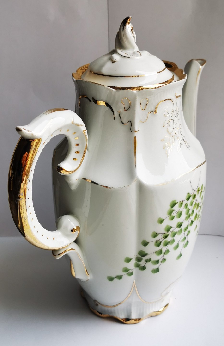 Kaffekande i porcelæn fra Bing & Grøndahl fra slutinngen af 19. århundrede. Dekoreret med bladværk på to sider. Fremstår i god stand uden skader eller reparationer. Fabriksmærket på bunden med B&G. H. 25½ cm (10.03 inches).