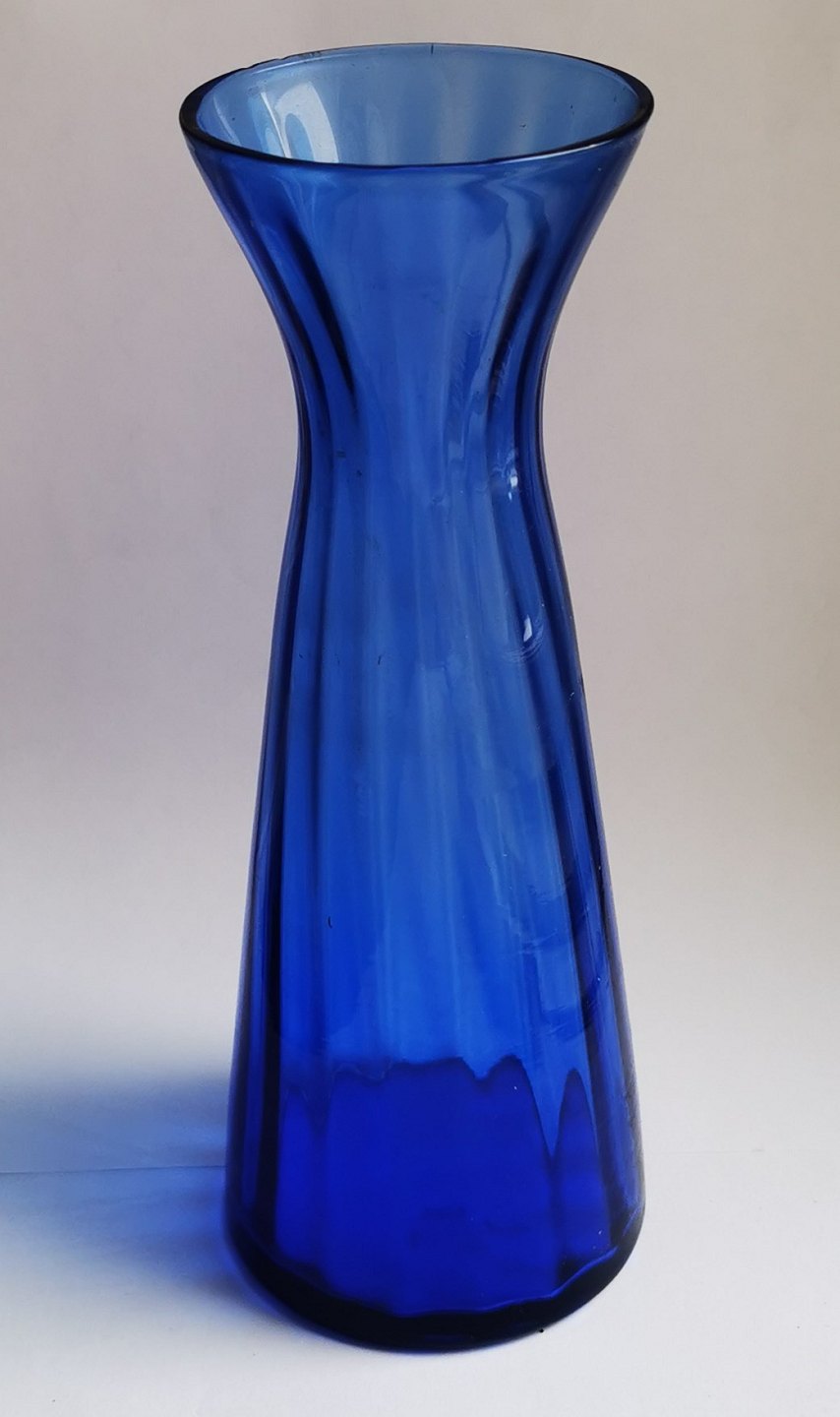 Dansk glasværk hyacint glasvase i blåt glas ca. 1920. Optisk vredet. Fremstår i god stand. Ingen skader eller reparationer. H. 21½ cm