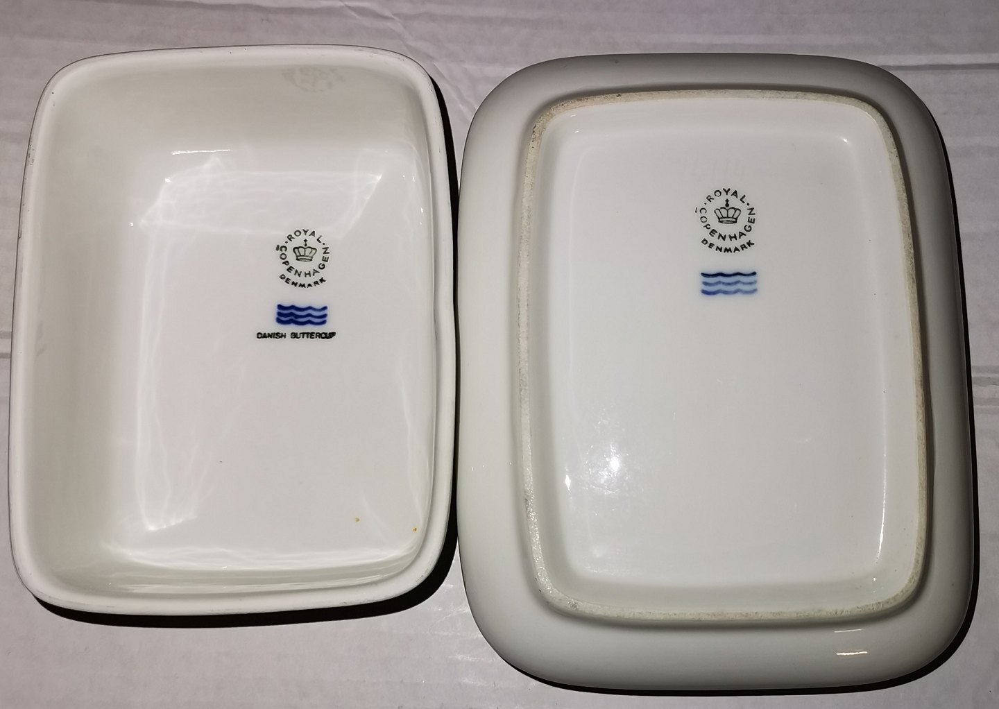 Royal Copenhagen smørskål i porcelæn. "Danish Buttercup" Dekoreret med blomster og sommerfugl i guld. Fremstår i perfekt stand. 1. sortering. Mål: H. 7 cm (2.75 inches). Underskålen måler 13 x 18 cm (5.11 x 7.08 inches).