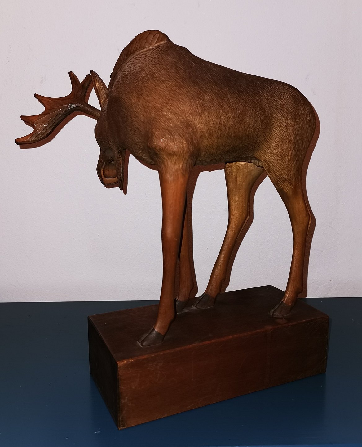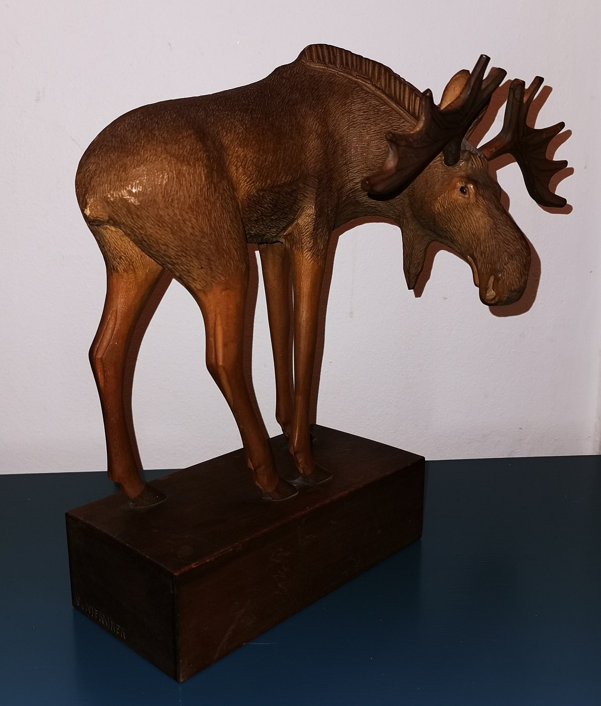 Vintage moose figurine hand carved in wood. Signed by the Finnish sculptor V. Niemnien on the backside of the base. Made around 1970. In good condition. No damages or repairs. The figure's antlers are loose. Measures: 31 cm high (12.20 inches) The base measures: 9½ x 20½ cm (3.74 x 8.07 inches).