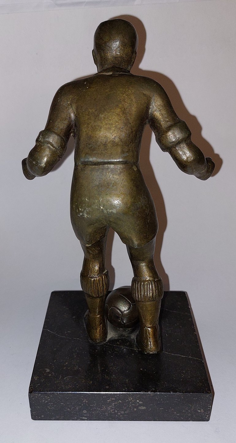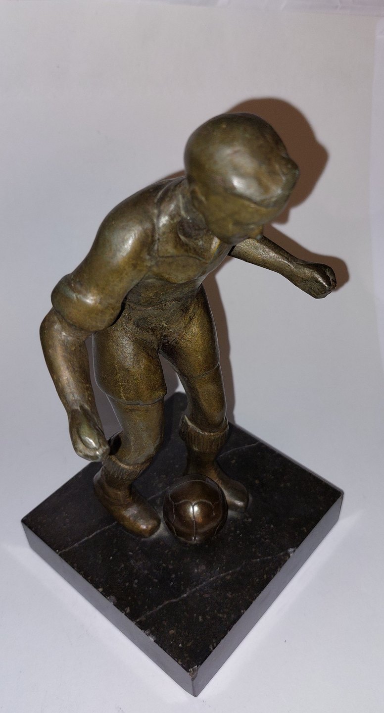 Figur af fodboldspiller i bronze. Stående på base af sten. Fremstår i god stand. Formodes fremstillet i 1930´erne. H. 21½ cm (8.46 inches).