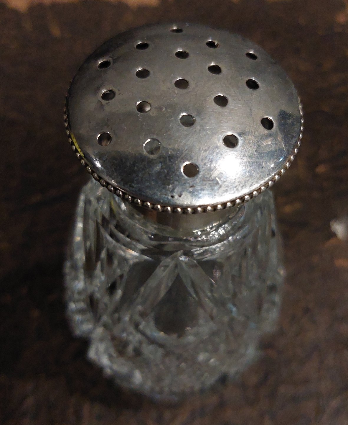 Strødåse i glas med sølvtop. Perfekt. H. 13,5 cm