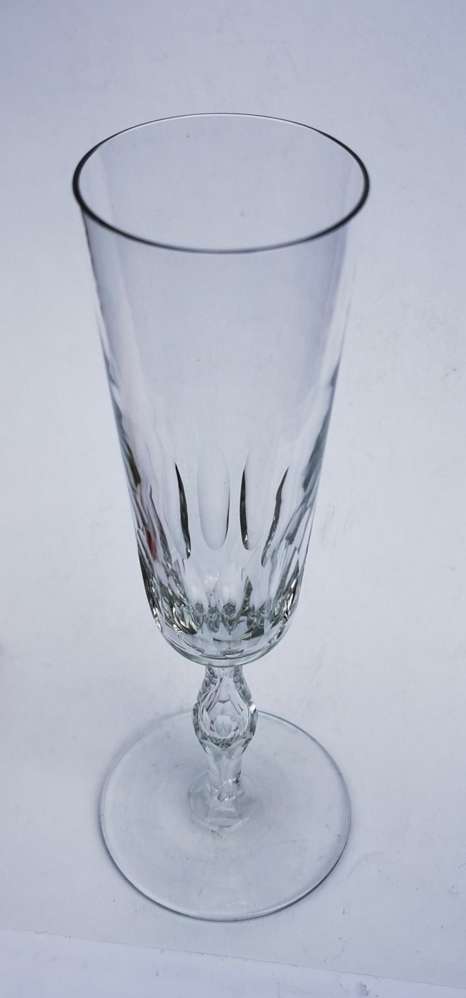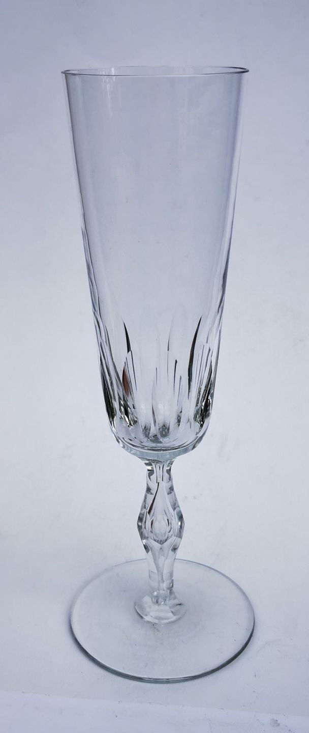 Champagnefløjte med olivslibninger på kummen a la Derby glasset fra Holmegaard Glasværk. Stilken er dog anderledes ! Fremstår i god stand uden skader eller reparationer. Fremstillet i begyndelse af 20. århundrede. H. 18 cm