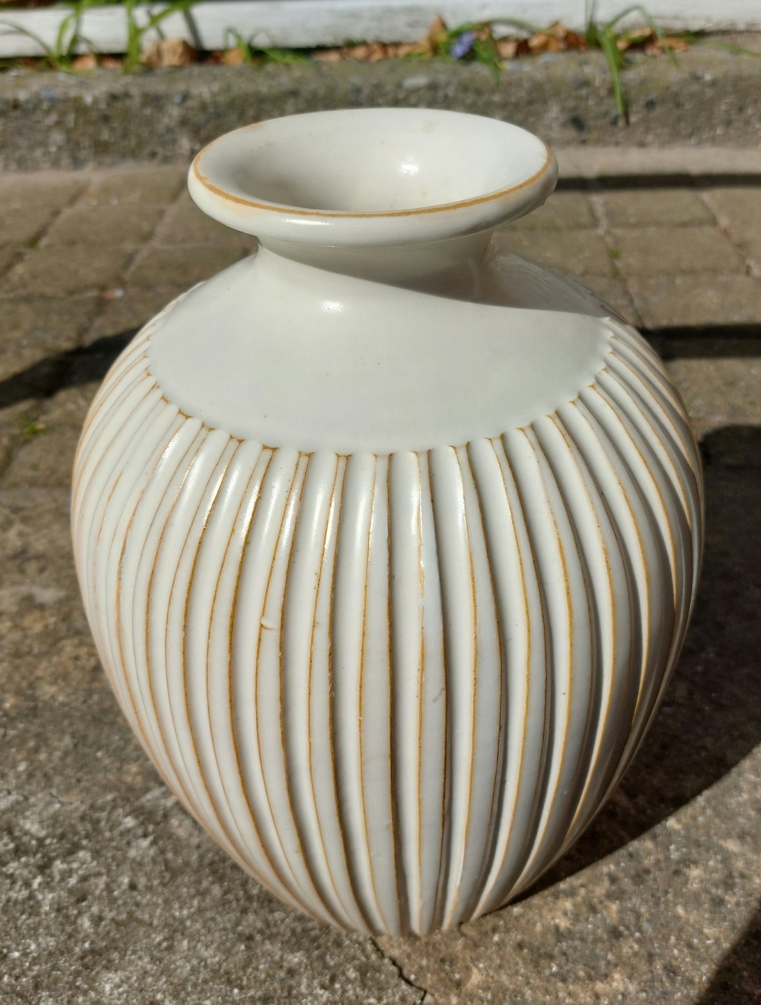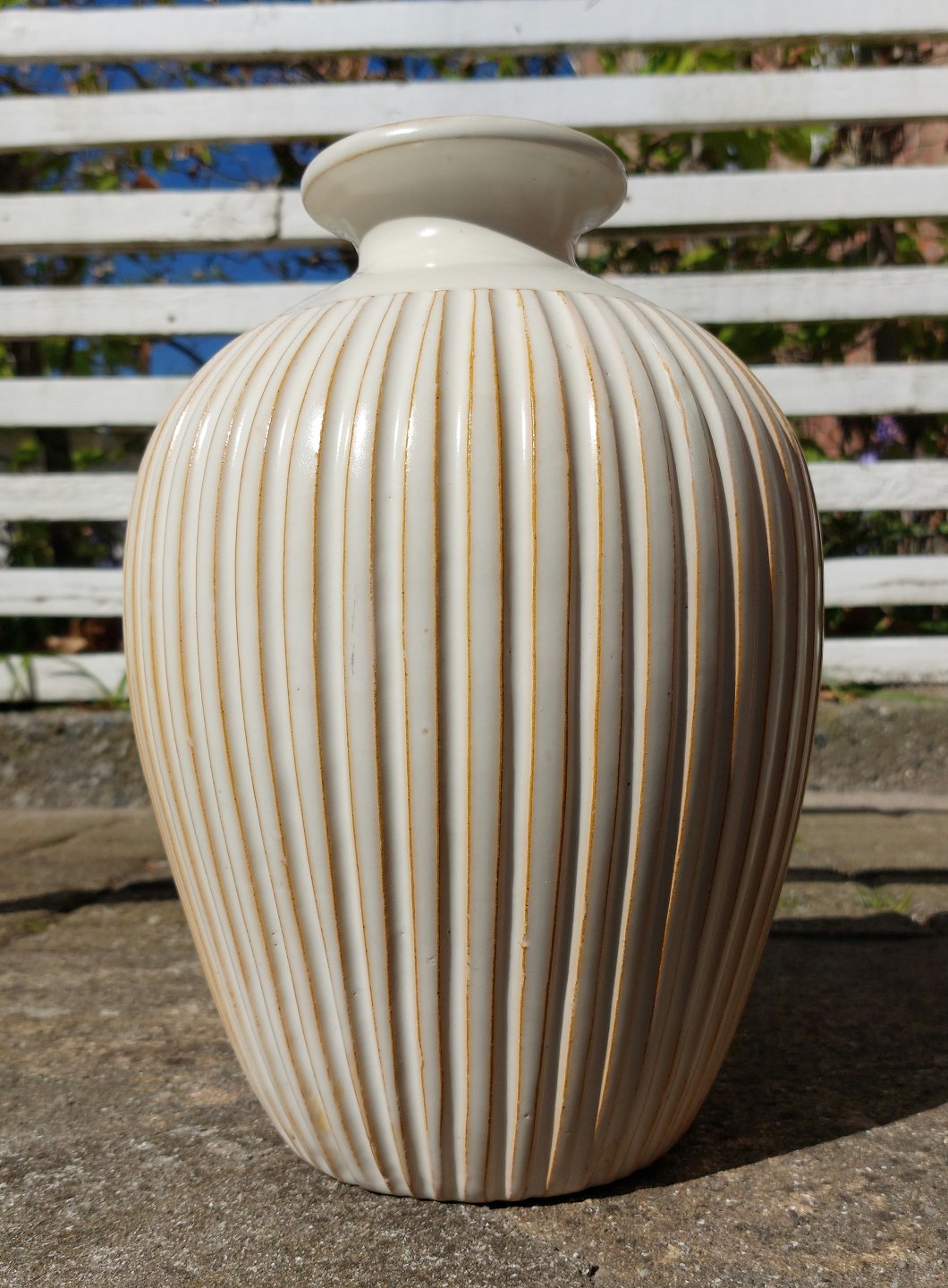 Vase i keramik med rillet dekoration rundt om vasen. Fremstillet i 1950erne. Designet af den danske keramikker Einar Johansen. Dækket af en lys blå glasur. Fremstår i god stand. Kunstnersignatur på bunden EJO. H. 29 cm (11.41 inches).