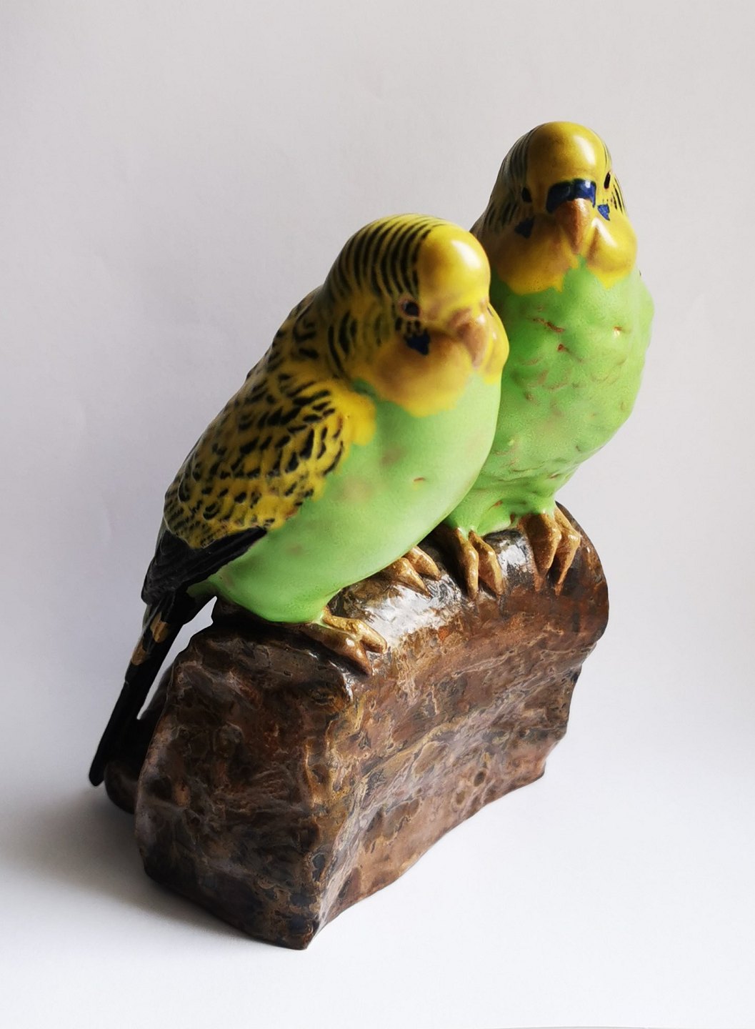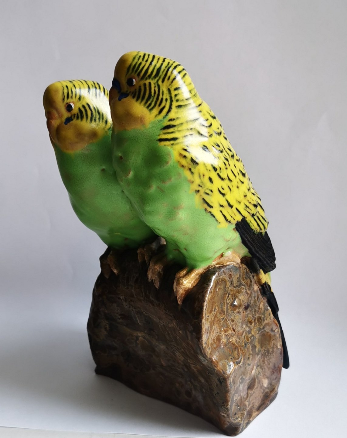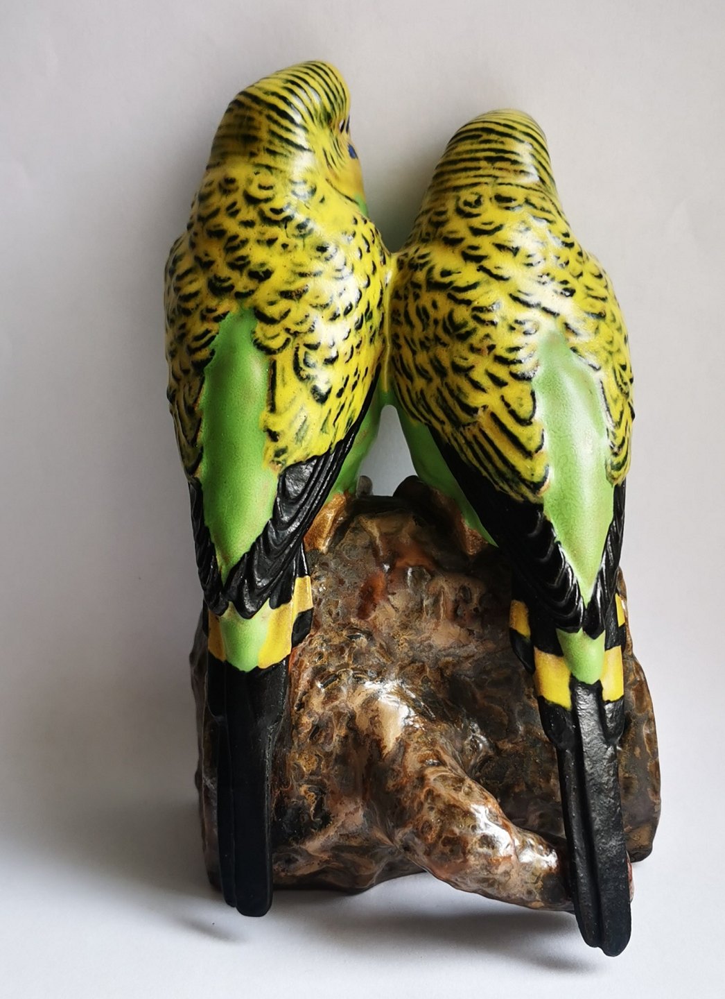 Fugle figur i keramik af to grønne undulater fra Aluminia fabrikken. Designet af Jeanne Grut. Fremstår i perfekt stand. 1. sortering. Ingen skader eller reparationer. Fabriksmærket på bunden. H. 16 cm .29 inches).