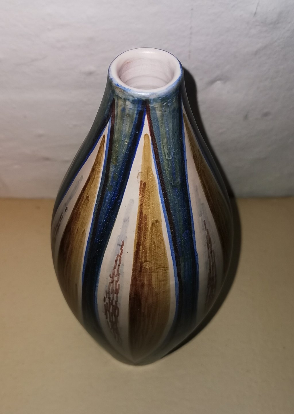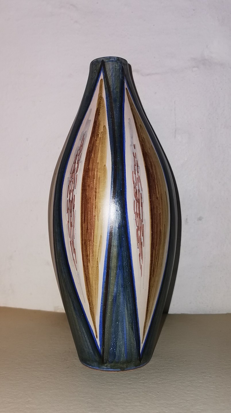 Olivformet vase i keramik fra Alma. Fremstår i perfekt stand. Ingen skader eller reparationer. Fabriksmærket på bunden med håndskrevet "Alma" DENMARK og modelnummer 93. H. 23½ cm.