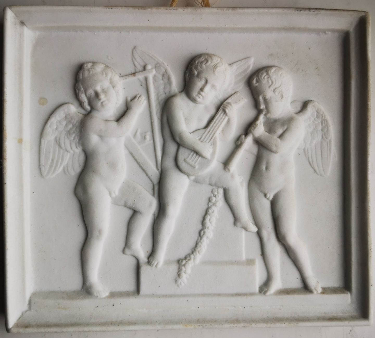 Antik platte i bisquit af Bertel Thorvaldsen (1770-1844): "De spillende engle" Skabt i Rom i 1831. Denne reproduktion fra Royal Copenhagen er fremstillet i slutningen af 19. århundrede. I god stand uden skader eller reparationer. Mål: 11 x 12½ cm (4.33 x 5.31 tommer).