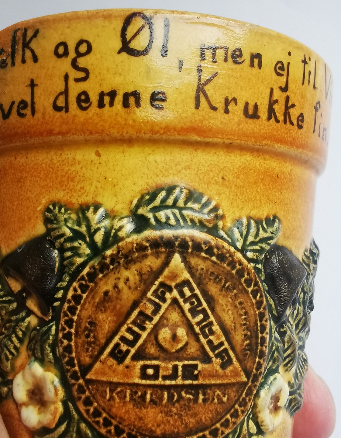 UNIKA ARBEJDE I KERAMIK: Peter Ipsen "krukke" i keramik (med hank) med dekoration i Skønvirkestil. Tekst på kruset: "Til Mælk og Øl, men ej til Vin, blev lavet denne krukke fin. Kredsen Anno 1915. Har et par reparationer indvendigt øverst på kanten - to steder (se fotos). Fabriksmærket på bunden med P. Ipsen København. H. 9½ cm (3.74 tommer).