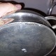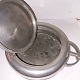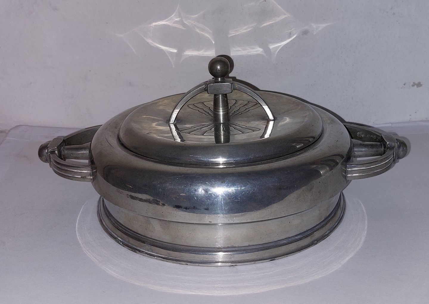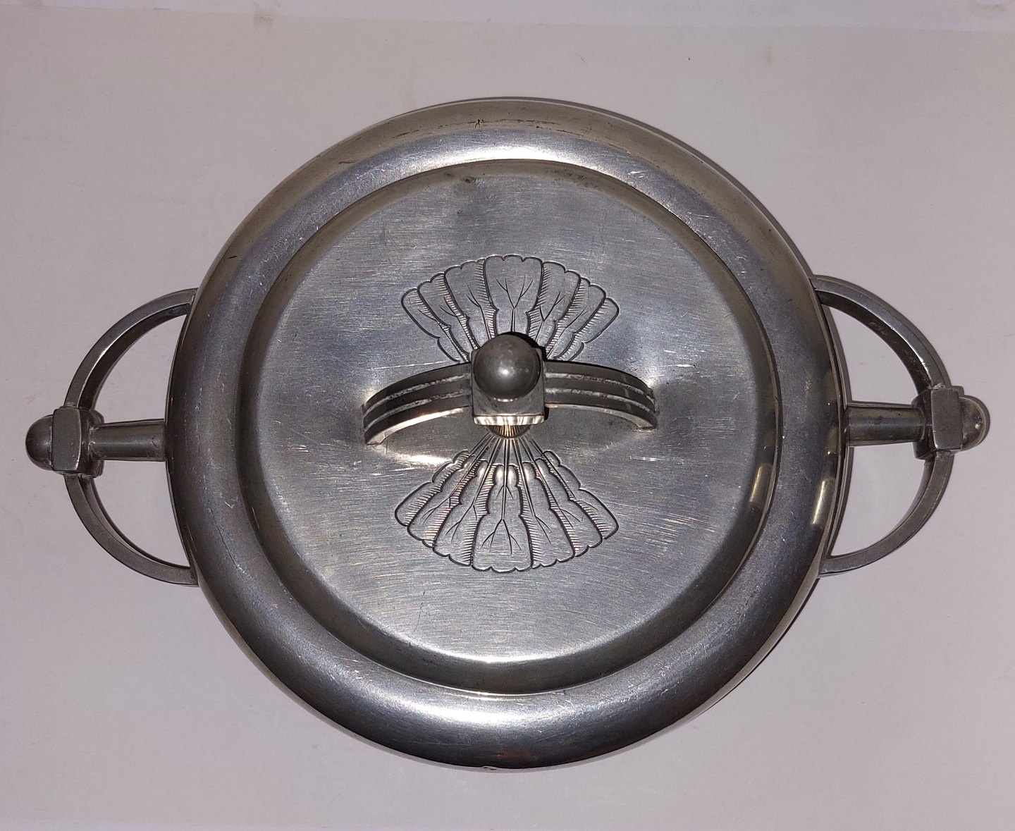Hankeskål med låg i tin med skønvirkedekorationer fra Mogens Ballin´s værksted i begyndelsen af 20. århundrede. Fremstår i god stand. Låget har en lille bule samt mindre reparation på kanten (se foto). Fabriksmærket på bunden med MB samt modelnummer T89. Mål: H. 10½ cm (4.13 tommer) Fra øre til øre 26½ cm (10.43 tommer).