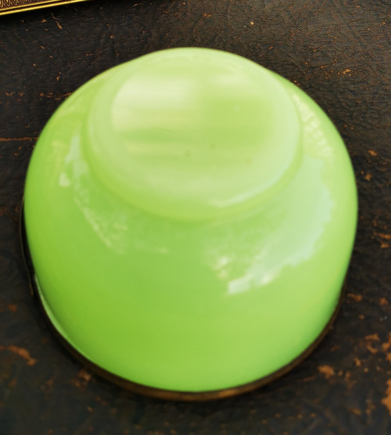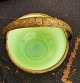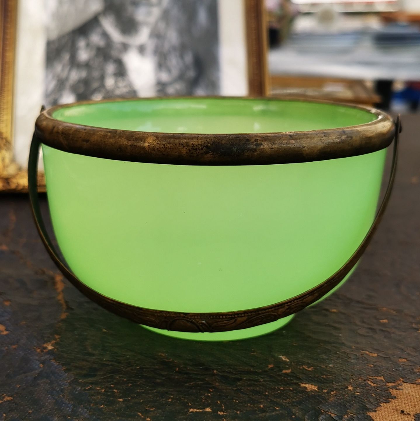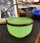 Sukkerskål i urangrønt glas med metalhank. Fremstår i perfekt stand. Ingen skader eller reparationer. Brugsspor på metalmonteringen. DEN GRØNNE FARVE ER MERE LYSENDE END DET FREMGÅR AF FOTOS. Mål: H. 7½ cm Ø. 12 cm