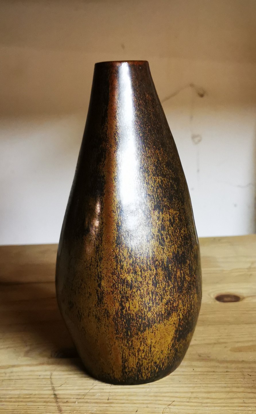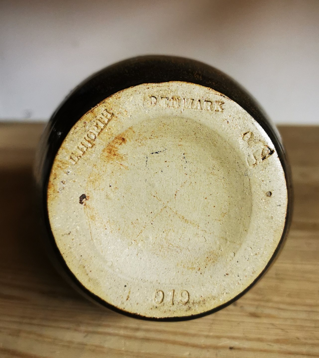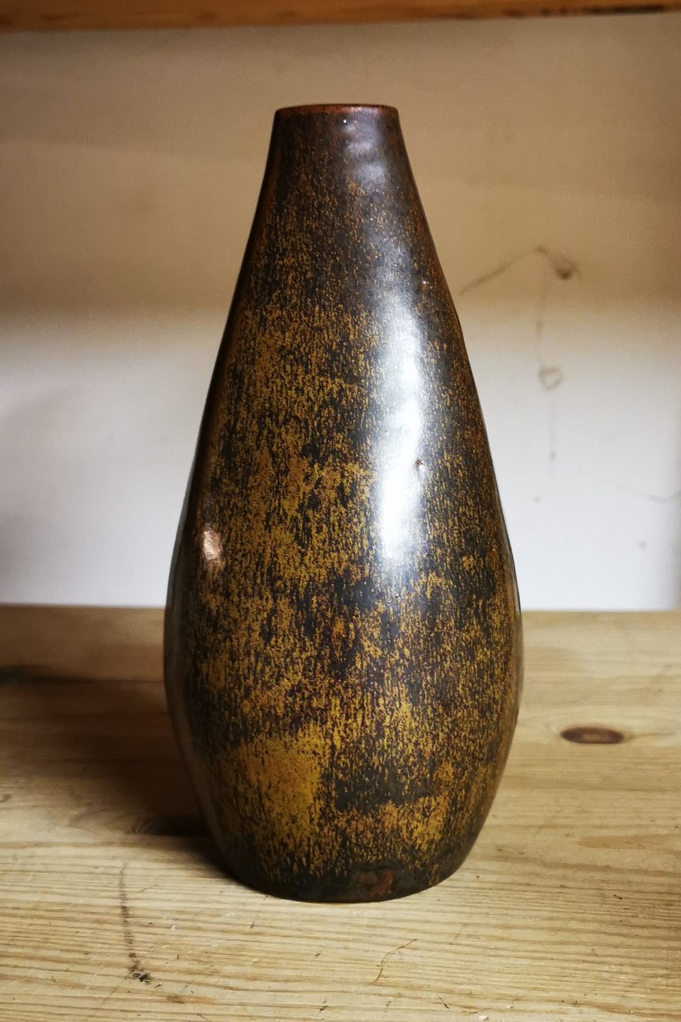 Vase i keramik fra Lauritz Hjorth, Bornholm, Danmark. Dækket af en brun glasur. Fremstår i god stand uden skader eller reparationer. Fabriksmærket på bunden. H. 20½ cm