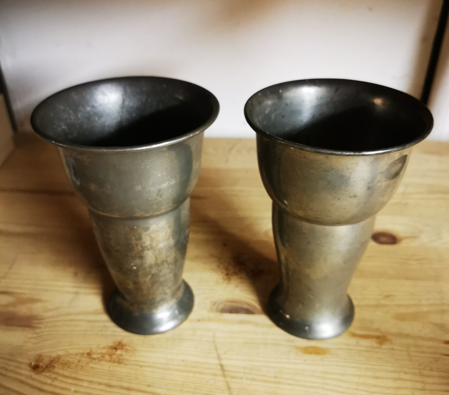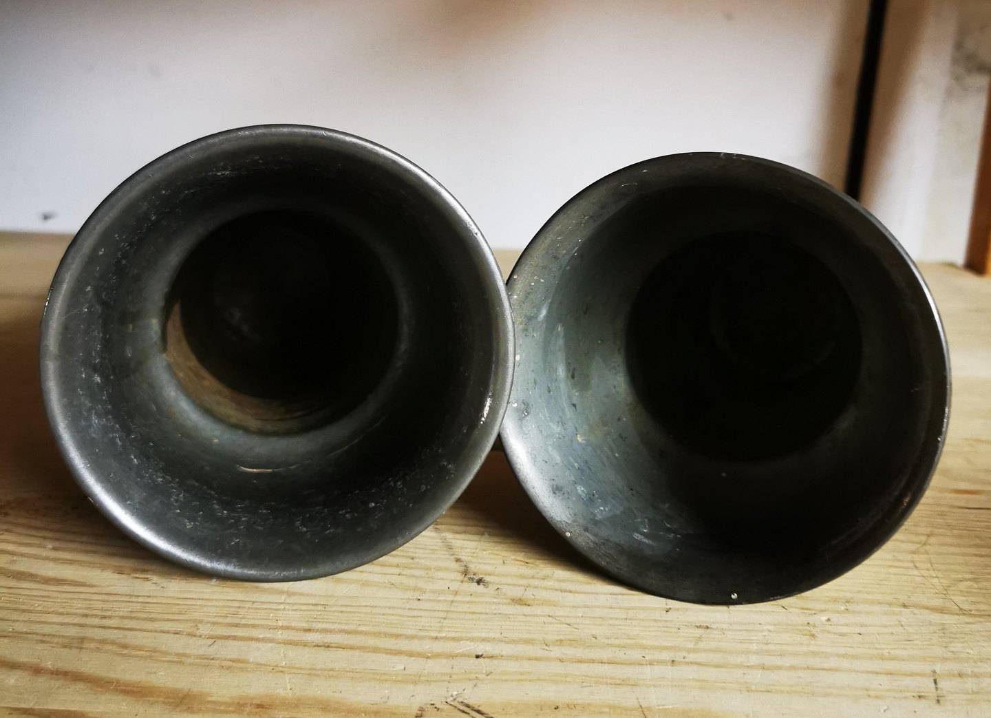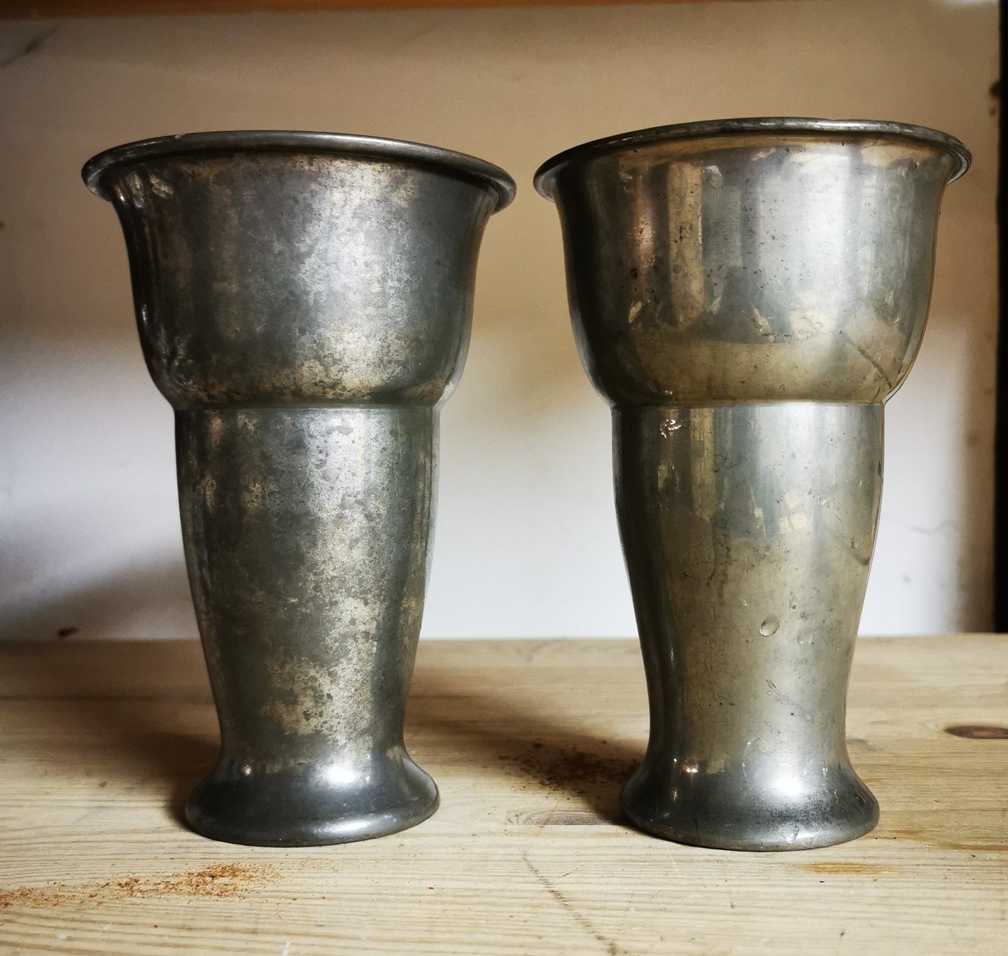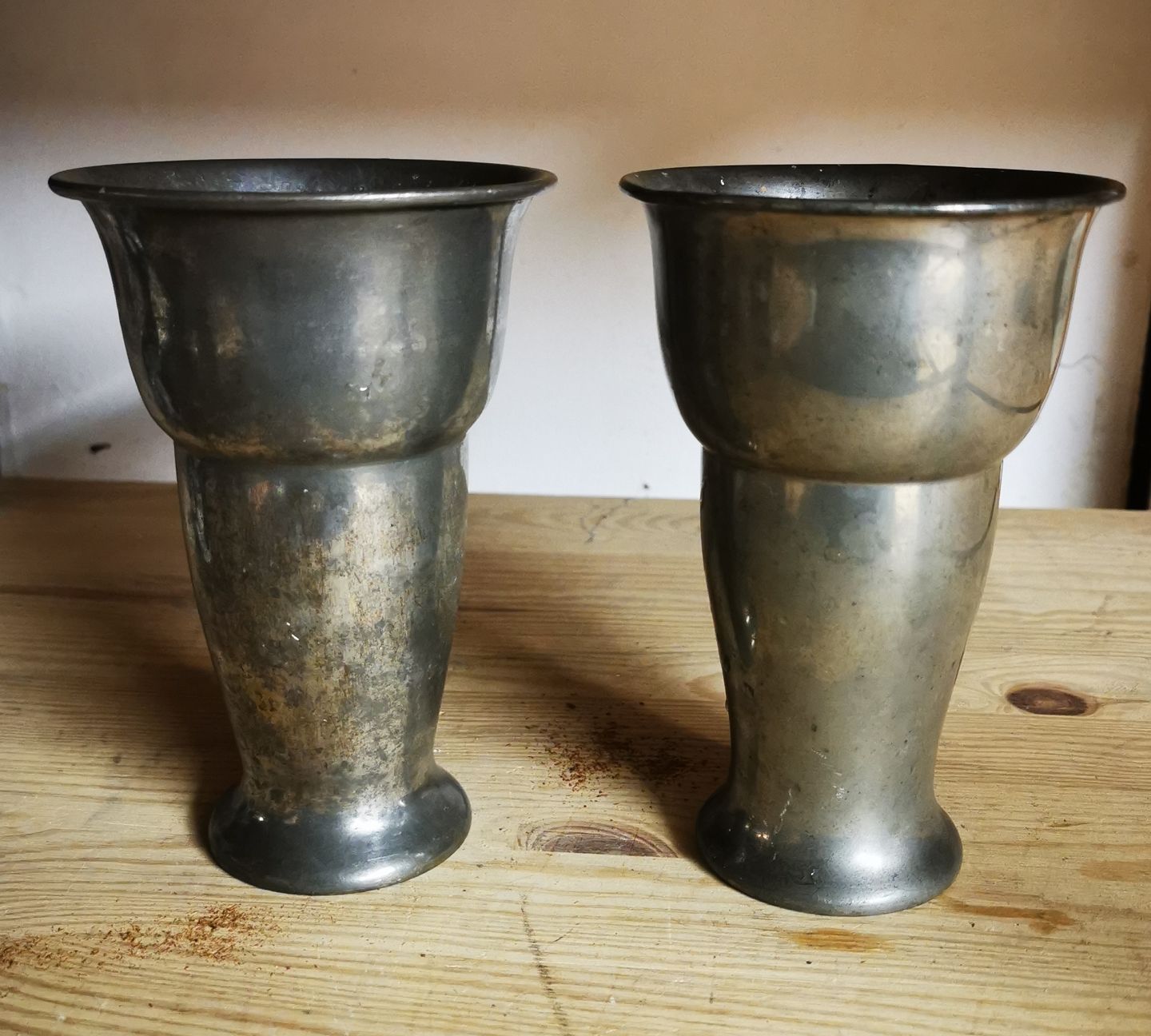 Par vaser i tin fra Hans Peter Hertz værksted. HPH overtog produktionen af emner produceret i alle materialer (metaller) fra Mogens Ballin's varesortiment fra begyndelsen af 20. Århundrede.