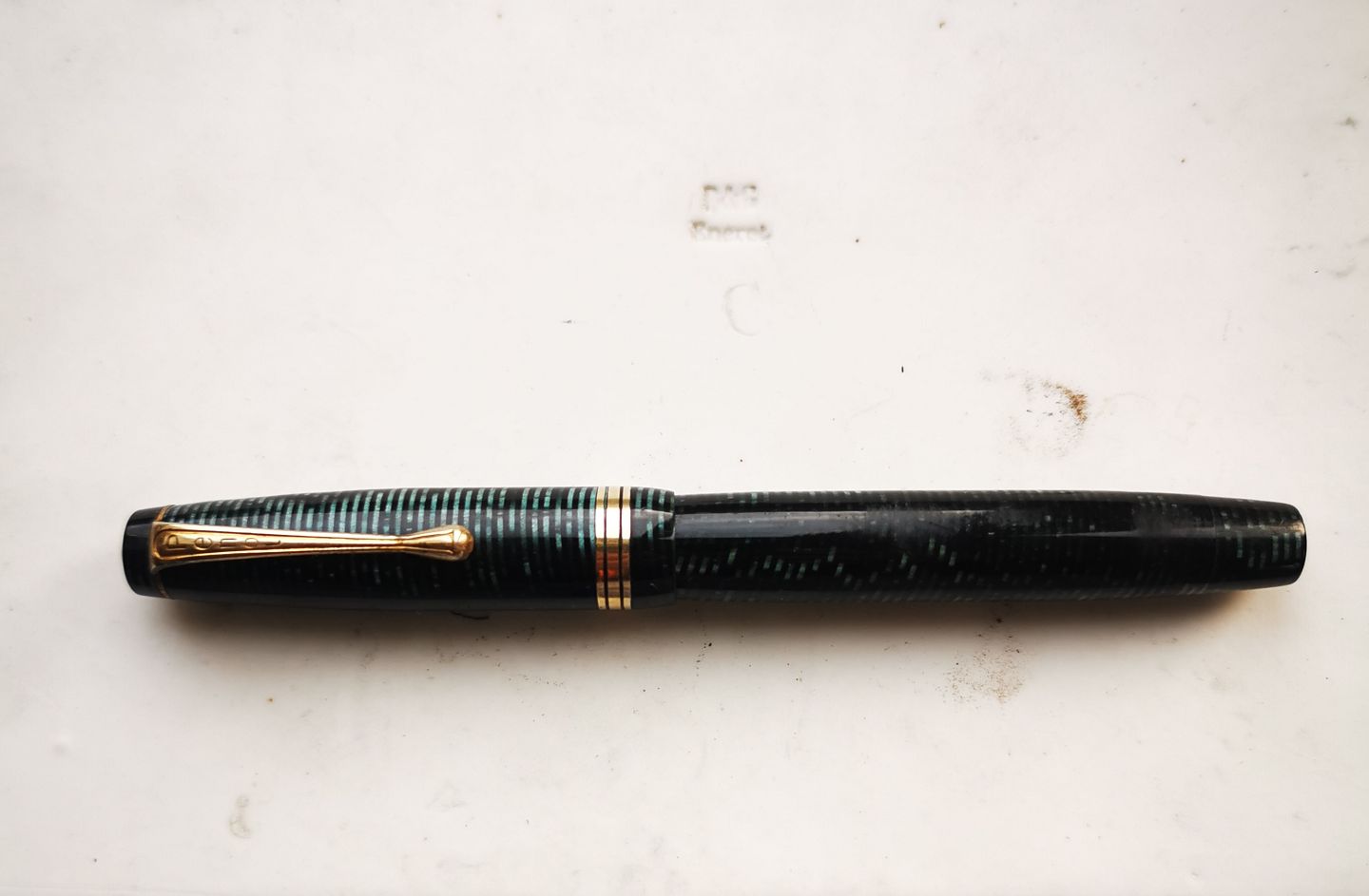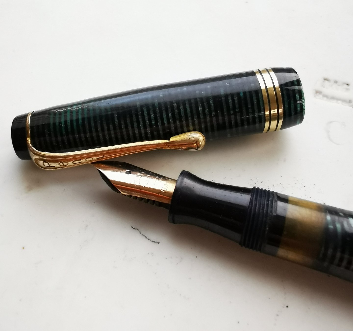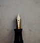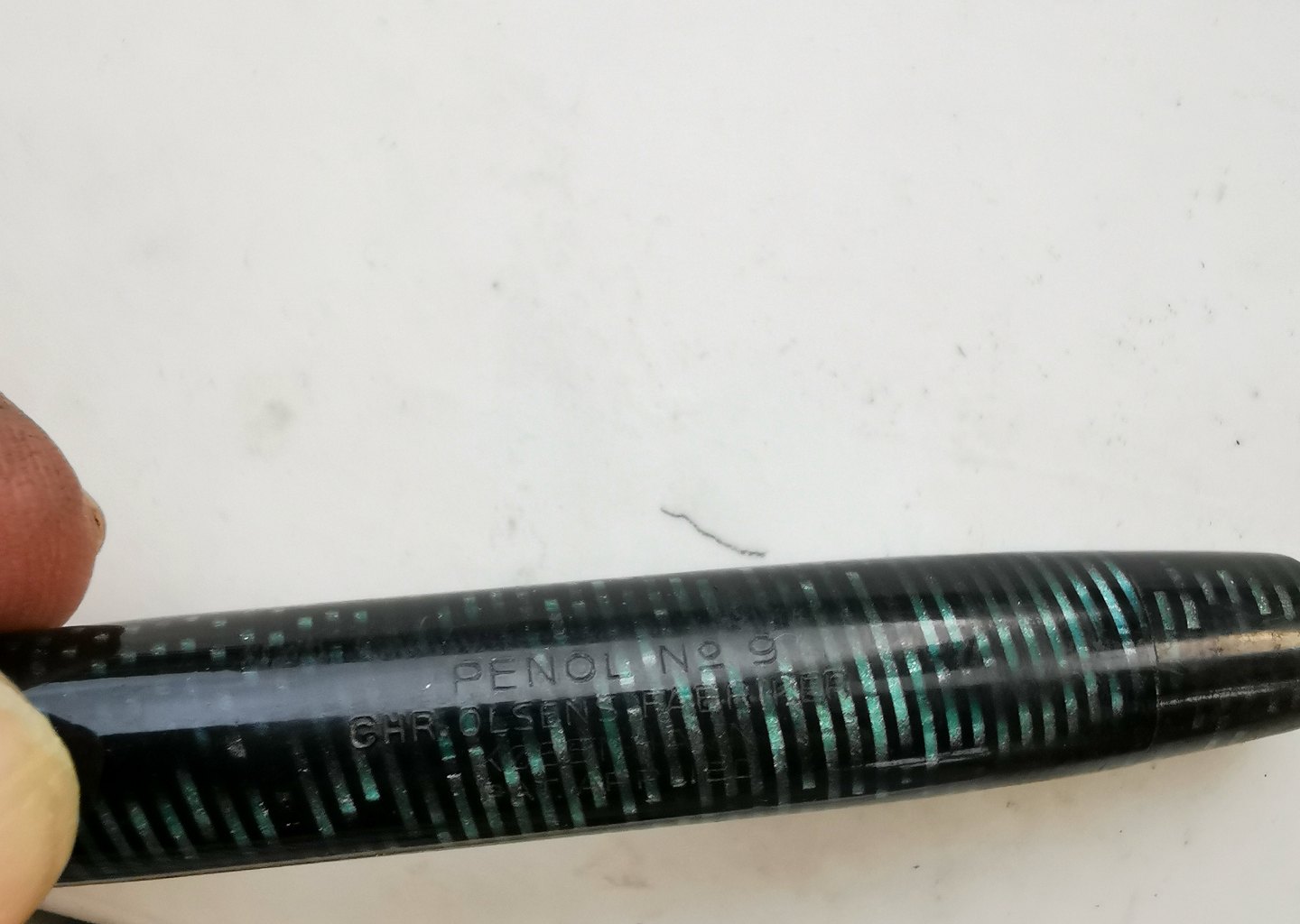 Penol no. 9 fyldepen fra 1940´erne. I god stand uden skader eller reparationer. Usædanligt mønster på denne fyldepen. Denne type marmoreretmed vandrette striber ses hyppigst på Parker Vacumatic fyldepennene fra samme periode. Tror Penol fabrikken er blevet inspireret herfra. Fungerer ikke før end der kommer ny gummisæk i. Dette kan tilkøbes for d.rk. 200,- Fyldepennen er 13 cm lang.